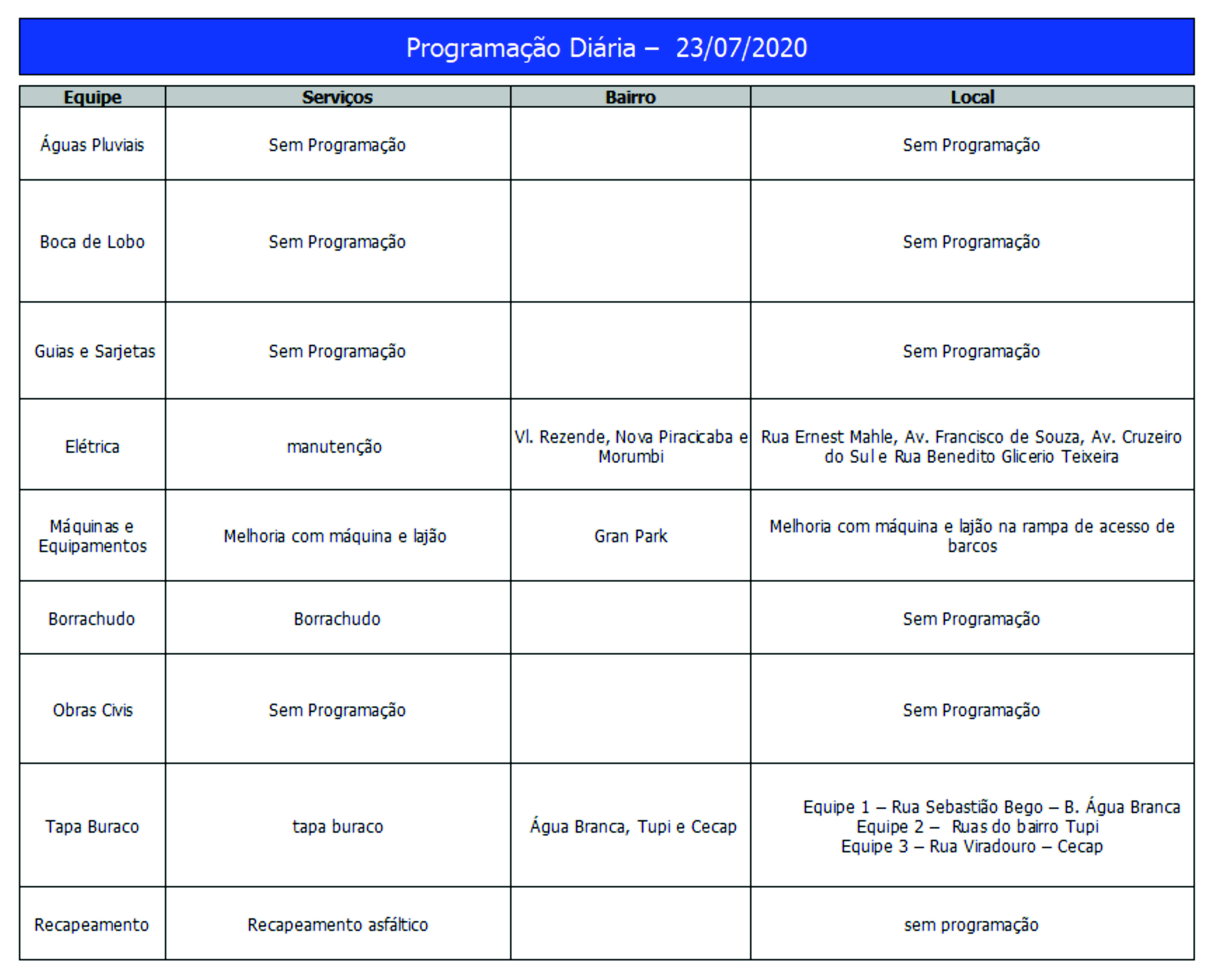 Programação da Secretaria Municipal de Obras