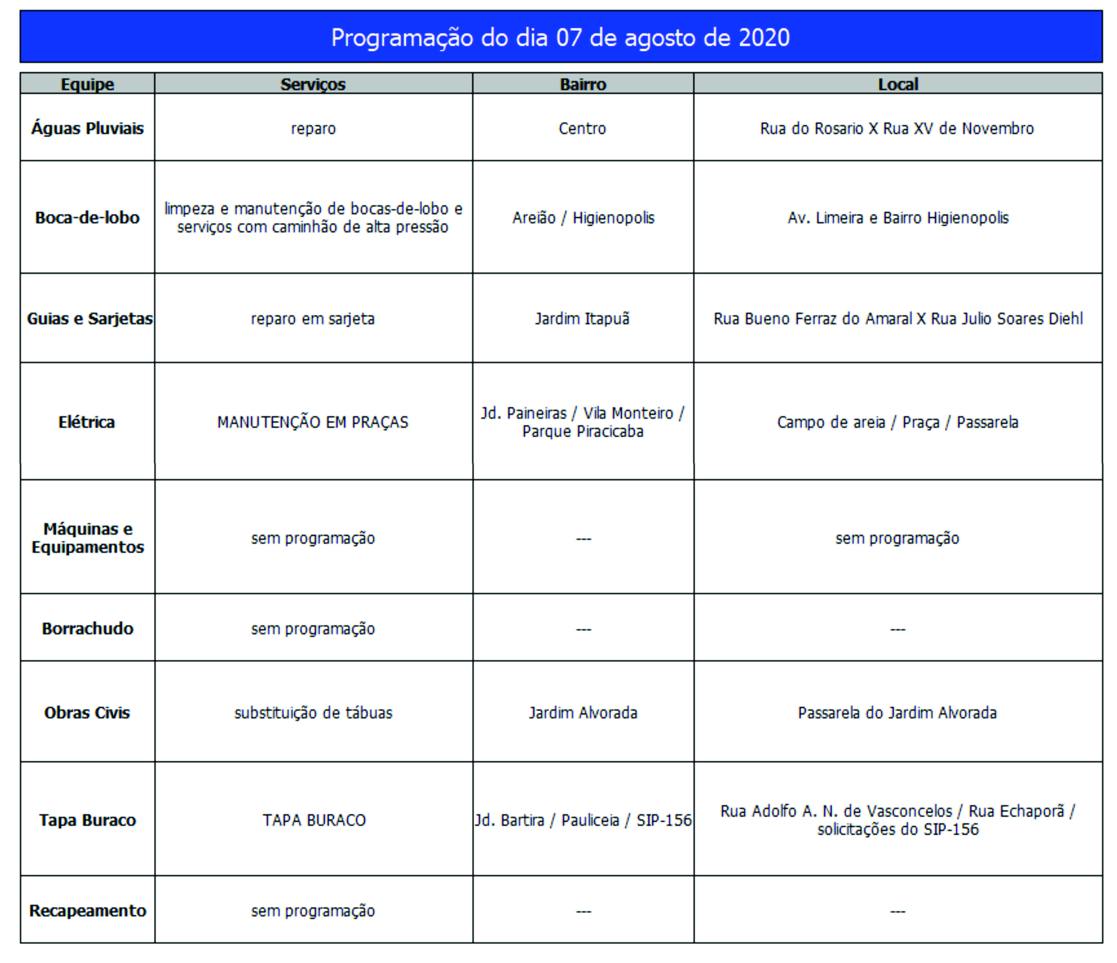Programação da Secretaria Municipal de Obras