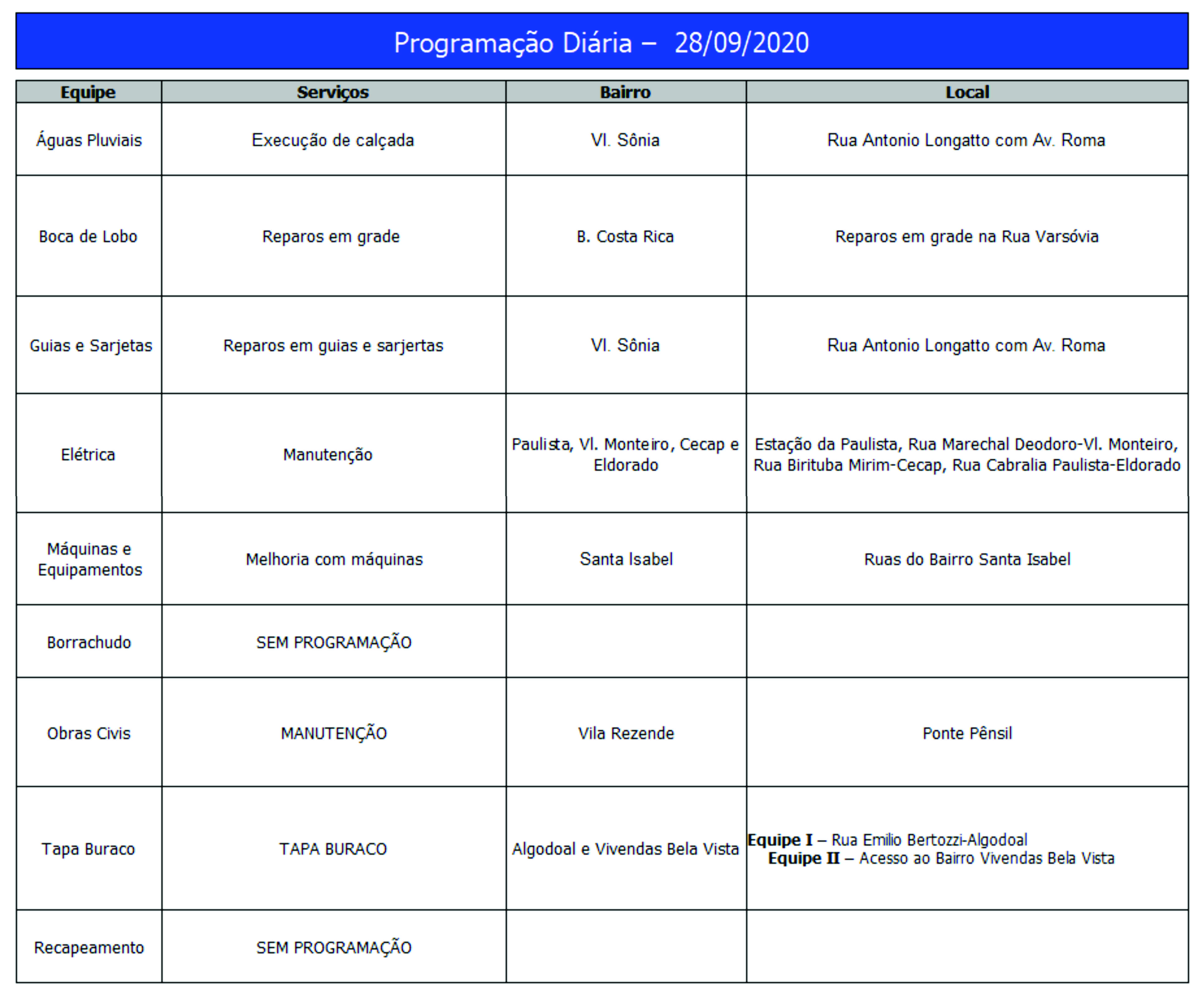 Programação da Secretaria Municipal de Obras