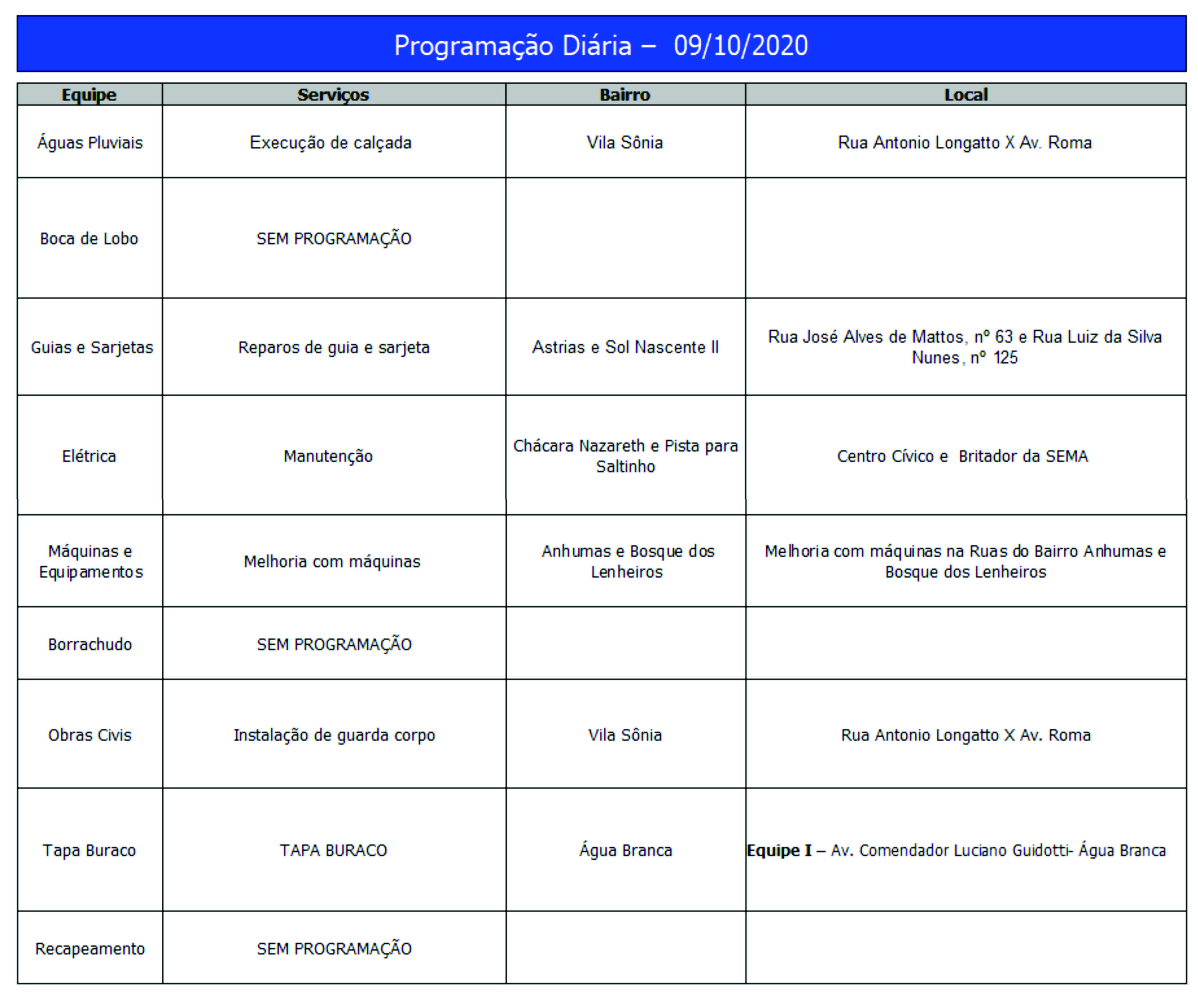 Programação da Secretaria Municipal de Obras