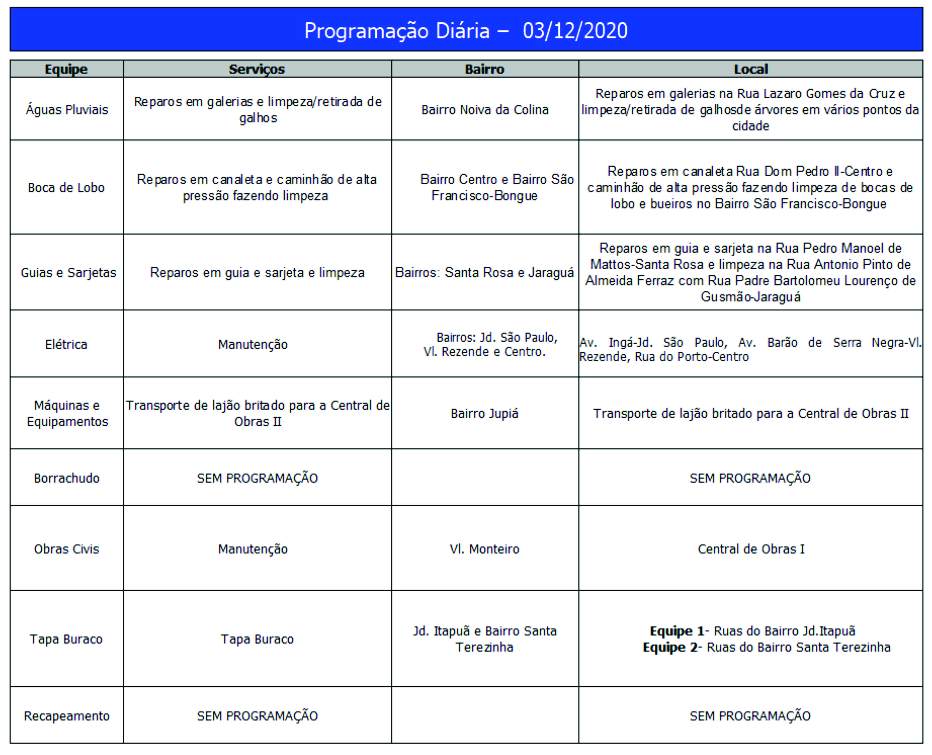 Programação da Secretaria Municipal de Obras