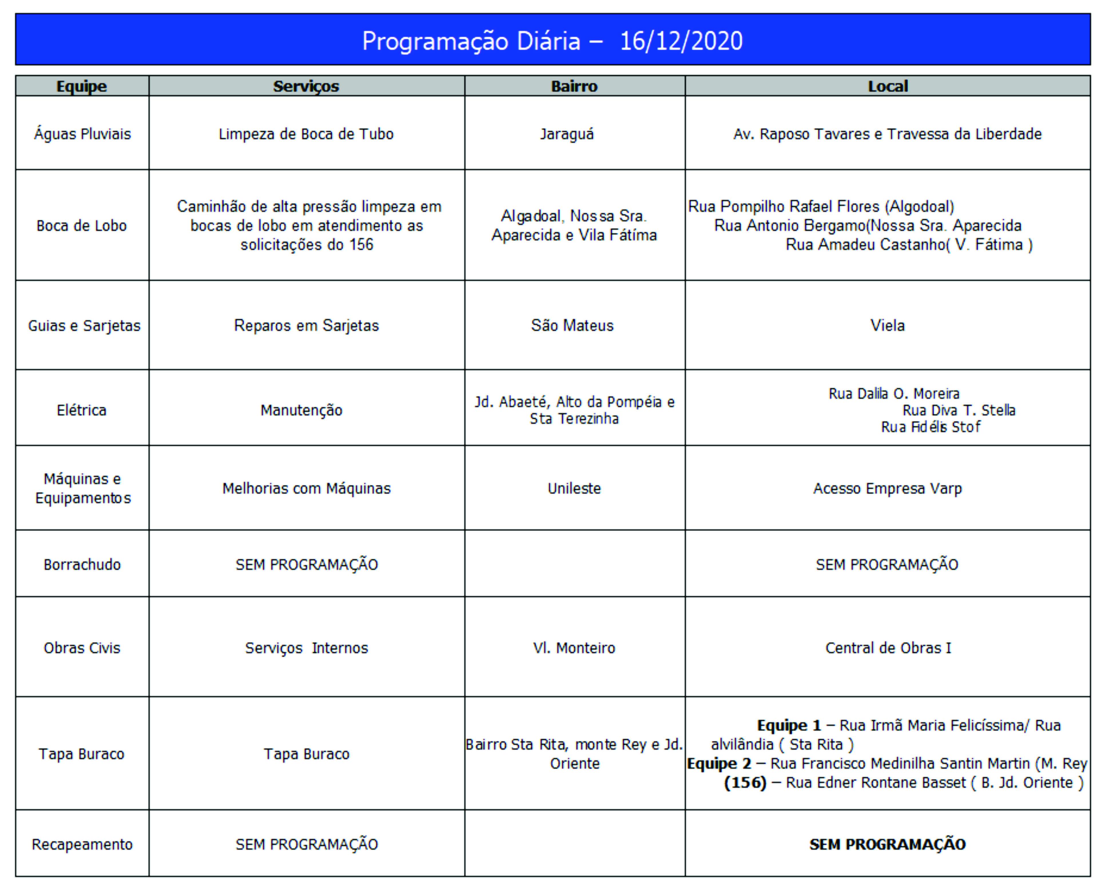 Programação da Secretaria Municipal de Obras