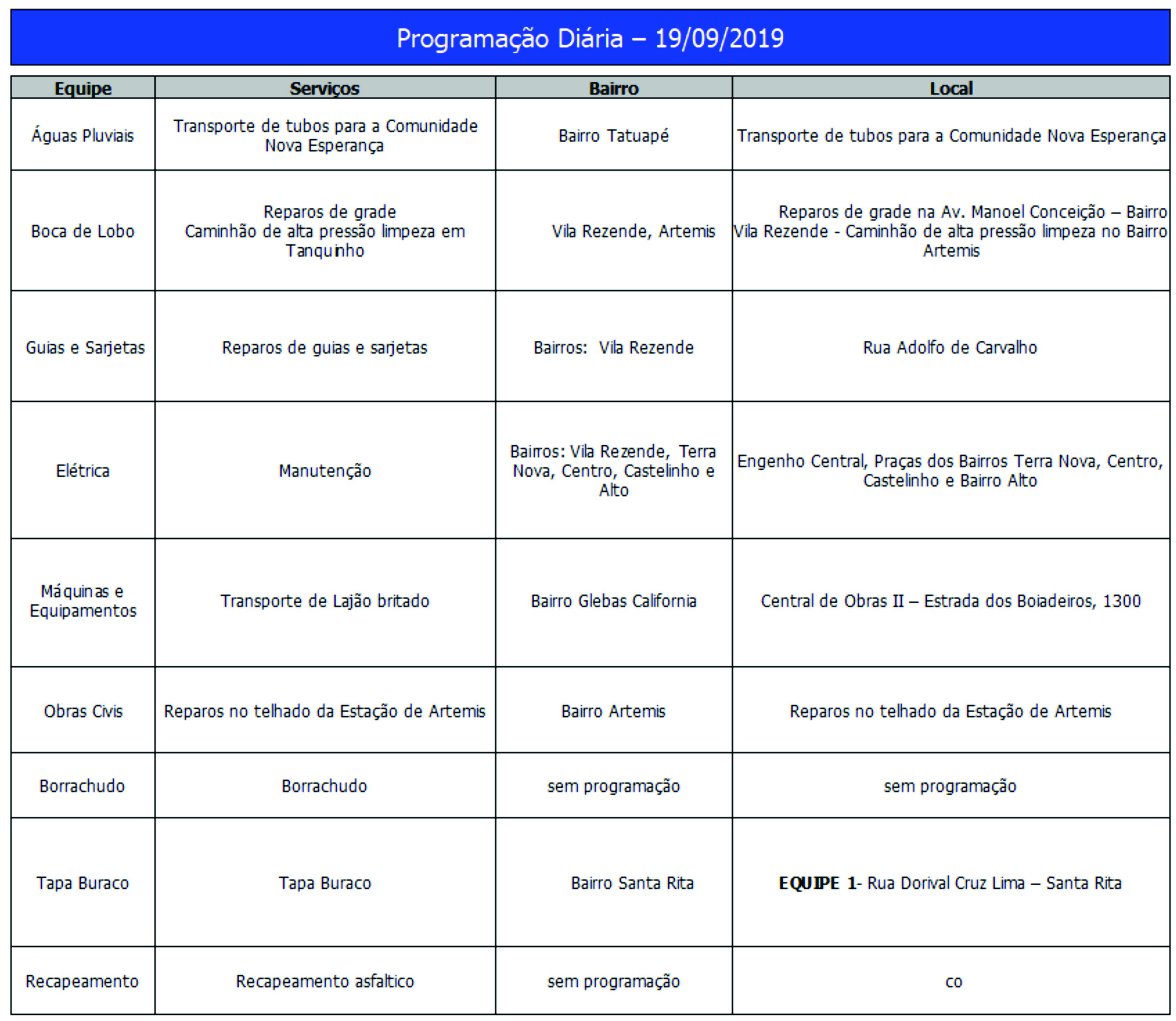 Programação da Secretaria Municipal de Obras