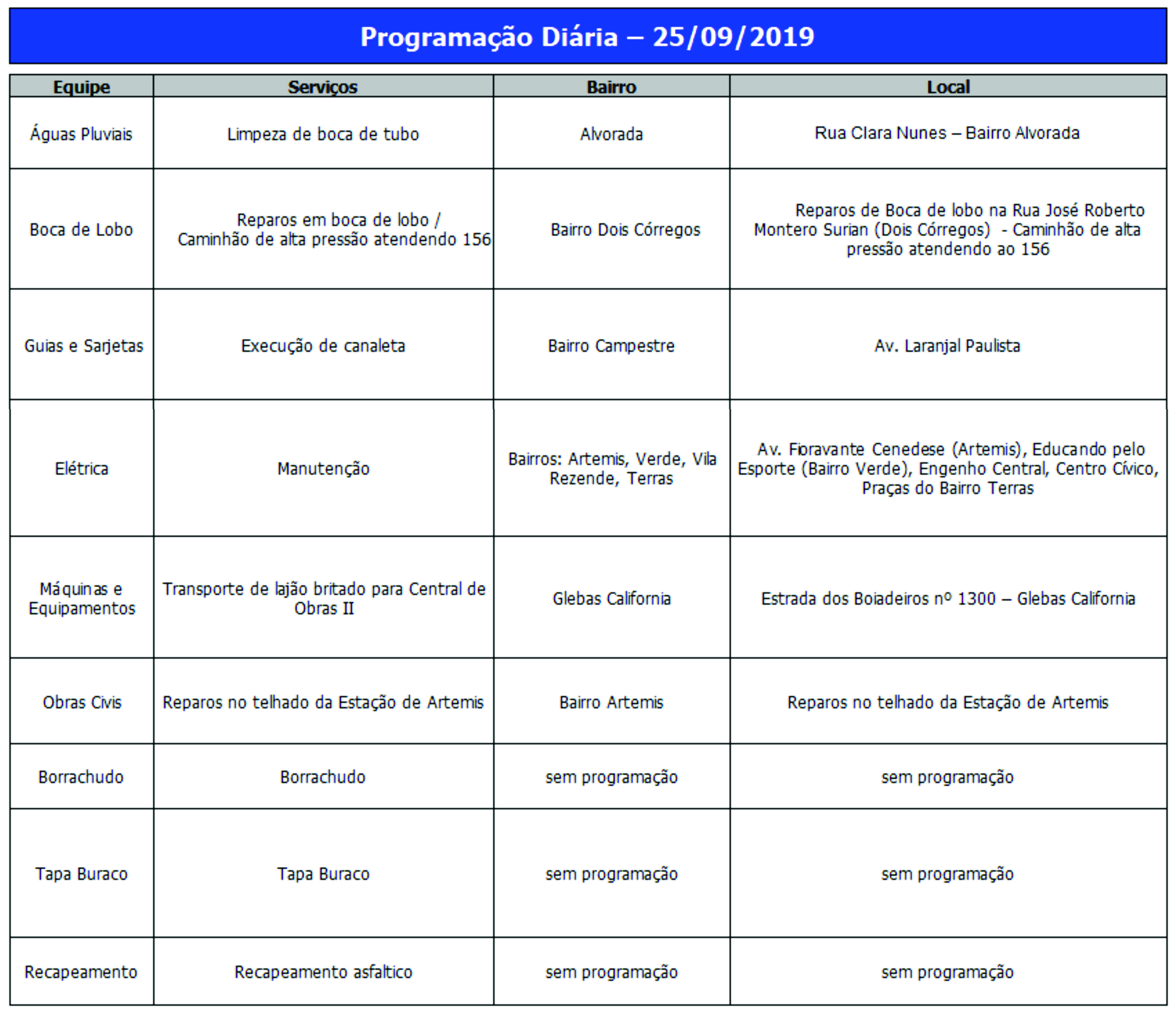 Programação da Secretaria Municipal de Obras
