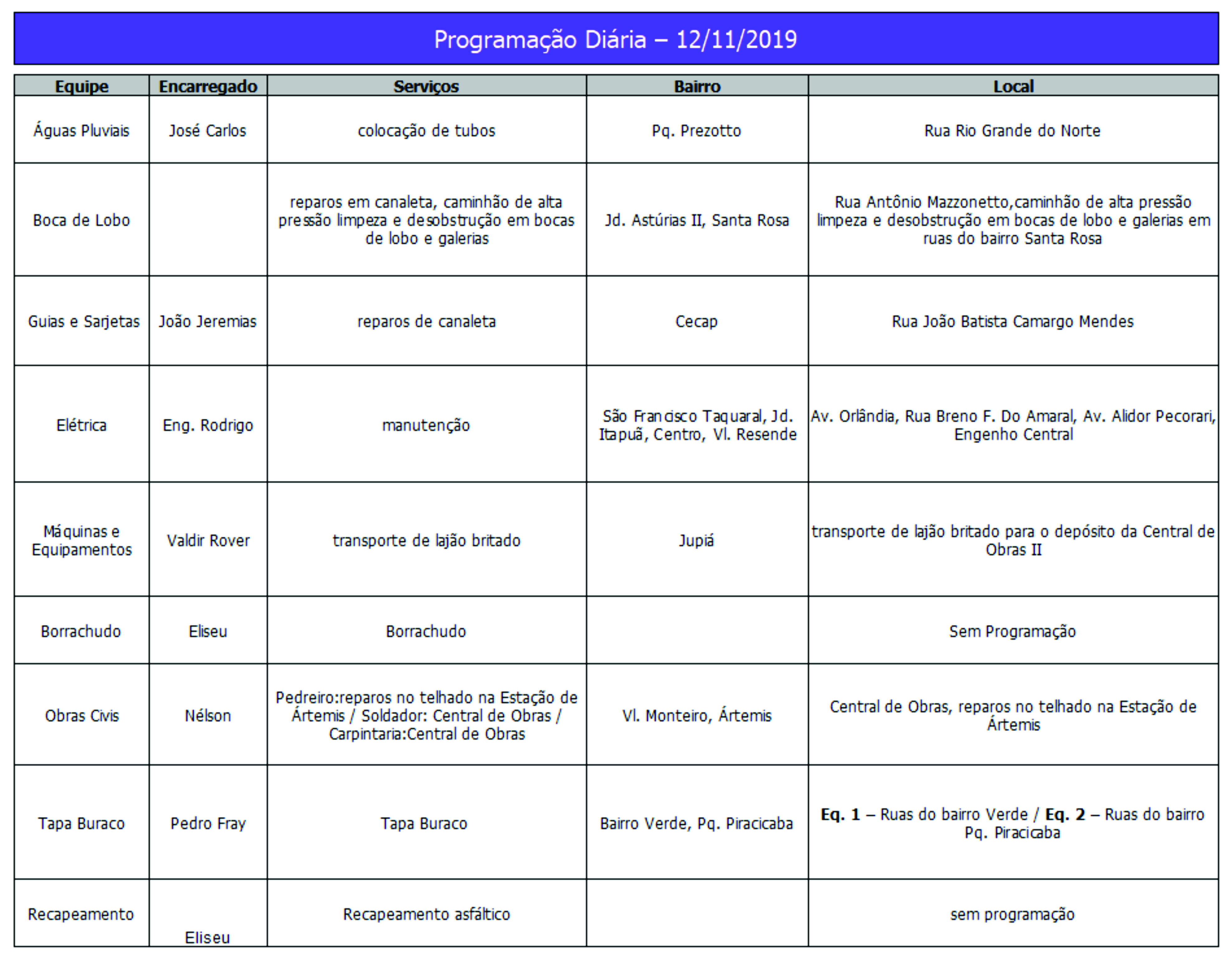 Programação da Secretaria Municipal de Obras