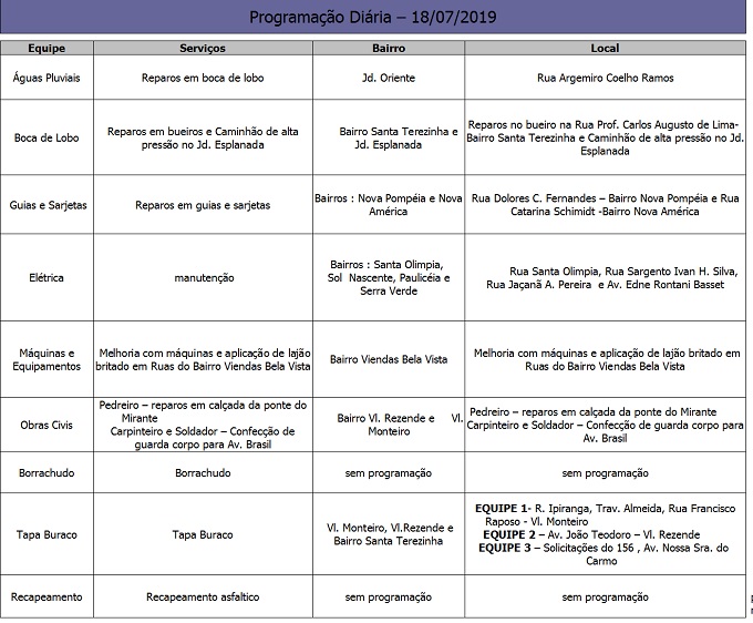 Programação da Secretaria Municipal de Obras