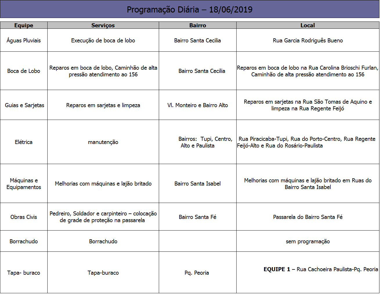 Programação – Secretaria Municipal de Obras