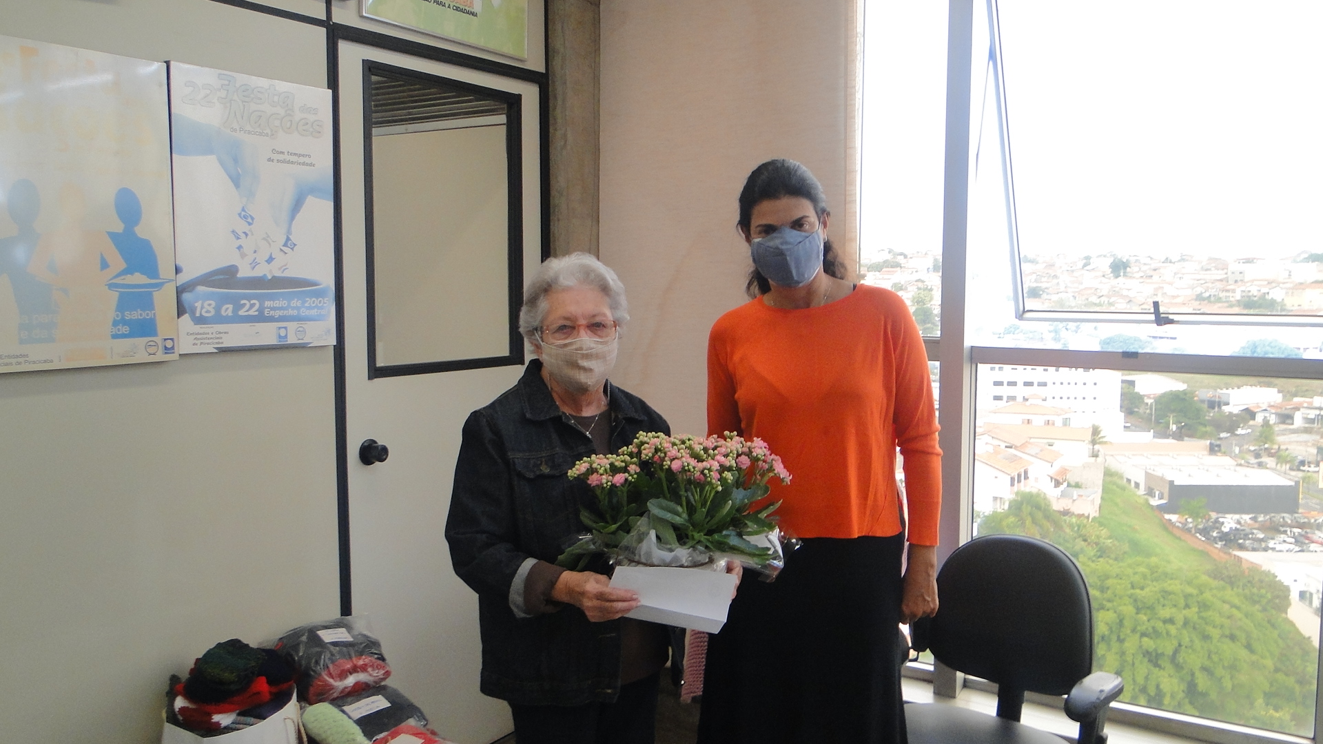 Representando todas as tricoteiras, participou da entrega, Hilda Mattos Stratico Jardim, que recebeu de Andréa Almeida um vaso de flores e uma carta em agradecimento à dedicação ao projeto. “Eu fiquei muito feliz por ter sido convidada para fazer parte deste projeto, conversei com a minha ‘patota’, que estava distante em função da pandemia e o movimento foi crescendo e chegamos a este resultado maravilhoso, abençoado”, comemora Hilda.