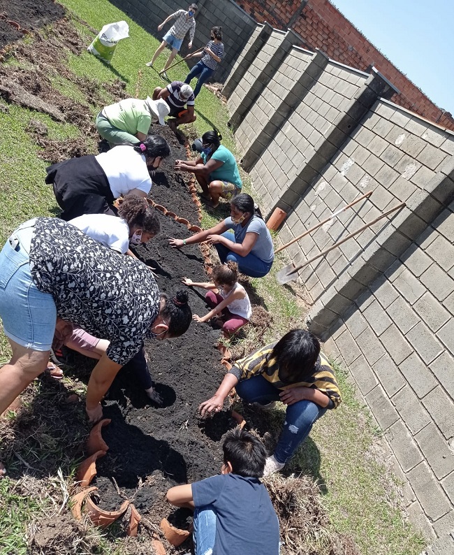 No sábado, 23/10, mais um espaço do bairro Novo Horizonte recebeu uma nova horta comunitária, desta vez na Escola Municipal Prof.ª Elisabeth Consolmagno Cruz. Famílias dos alunos do Ensino Fundamental e do EJA (Ensino de Jovens e Adultos) participaram da oficina de montagem da horta.