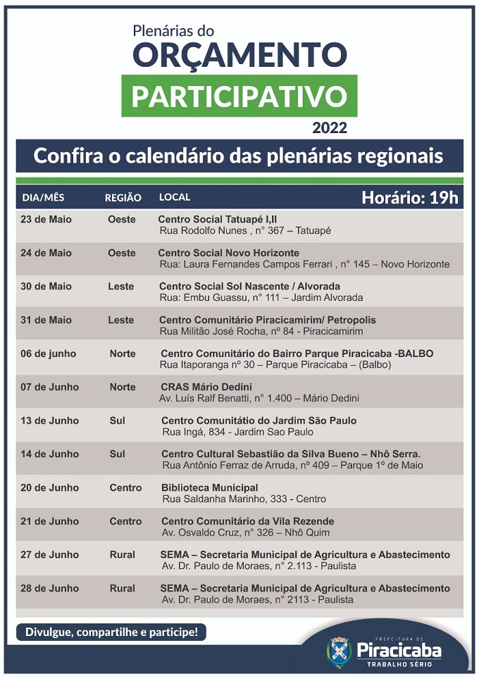 SERVIÇO – Plenárias do OP. Segunda-feira, 30/05, no Centro Social Sol Nascente/Alvorada, na rua Embu Guassu, 111, Jardim Alvorada. Terça-feira, 31/05, no Centro Comunitário Piracicamirim/Petrópolis, na rua Militão José Rocha, 84 – Piracicamirim. Às 19h.