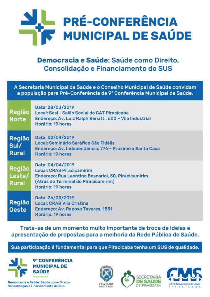 Os encontros regionais terão a função de preparar a comunidade local e eleger como delegados profissionais da saúde do setor público – que trabalham nos postos de saúde de cada região – para a 9ª Conferência Municipal de Saúde, a ser realizada nos dias 13 e 14 de abril, no Centro Cívico da Prefeitura de Piracicaba.