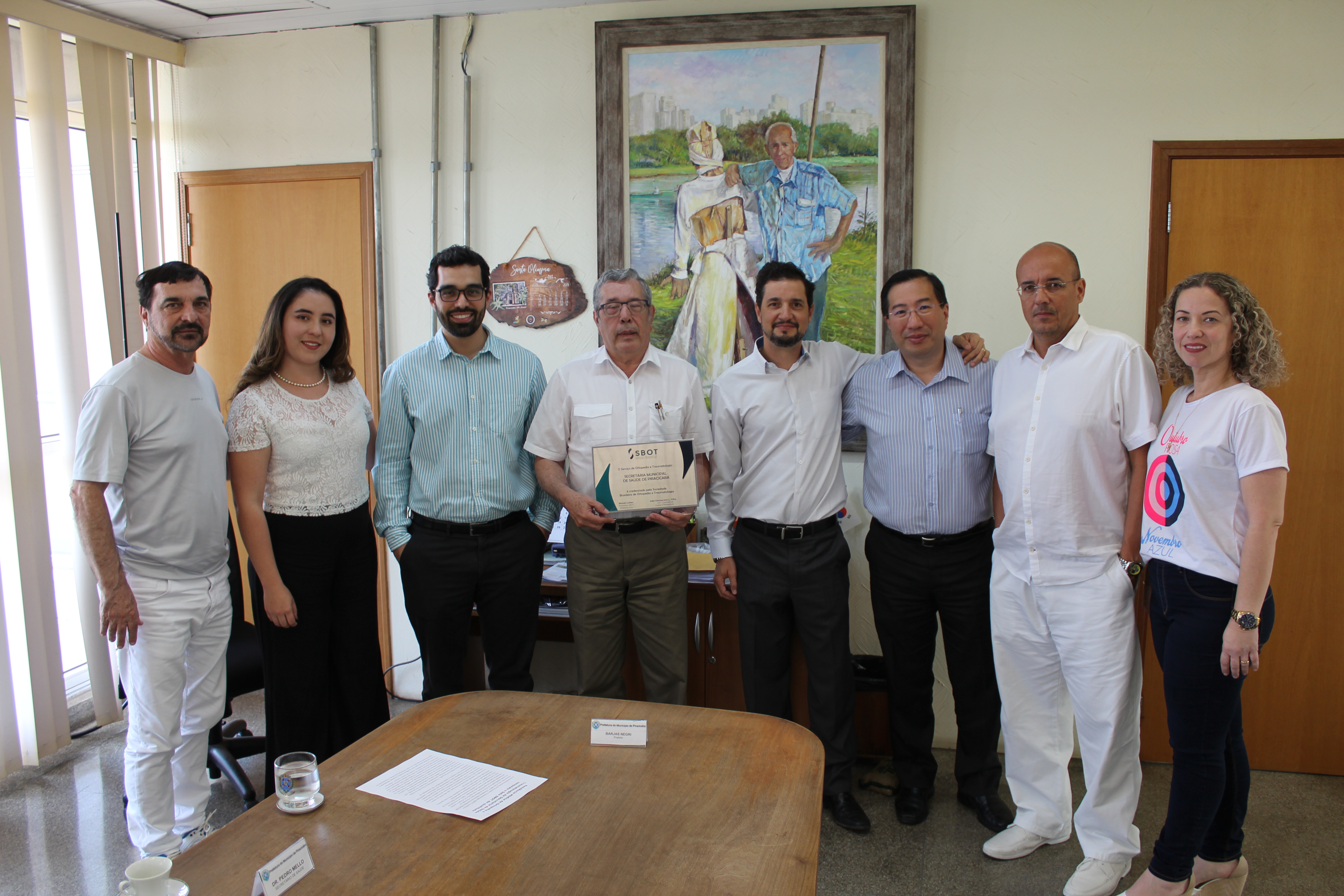 Dr. Pedro Mello, Miki Mochizuki, diretor técnico do HFC, a residente Viviam Stephany Achury Bernal, Alexandre Pacheco, Daniel Mello, Tatiana Bonini, coordenadora da Atenção Básica , Adriano Barros Fonseca, preceptor do COT e José Coral, presidente do HFC