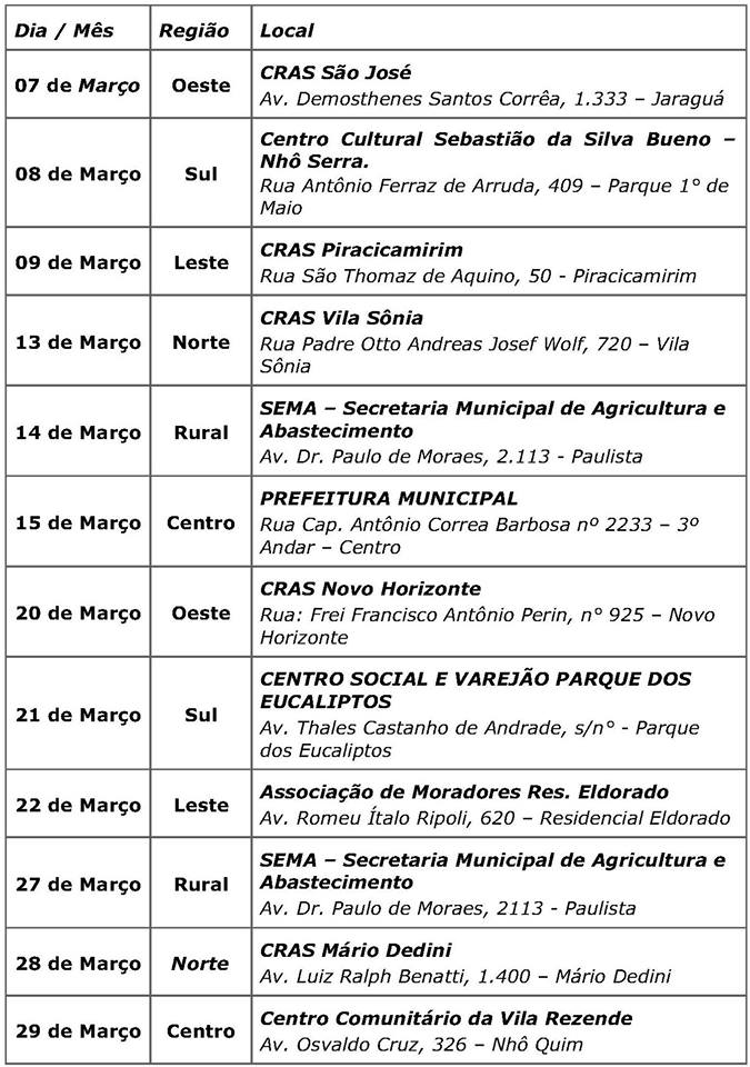 As plenárias regionais do orçamento participativo estão planejadas para ocorrer conforme quadro abaixo