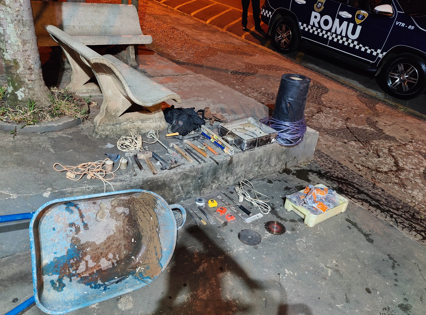 Foram furtados da obra 27 sacos de pregos, uma mangueira de nivelamento, um rolo de plástico preto, dois discos de maquita, duas extensões, uma faca grande, um esquadro, três trenas métricas, um rolo de linha de pedreiro, três talhadeiras, uma chave de roda, uma chave de fenda, dois prumos, uma carriola, duas marretas, uma truqueza, uma furadeira, três martelos, uma broca de 10mm, dois níveis de mão, um ebulidor, uma bolsa de costas e um esquentador de marmita.