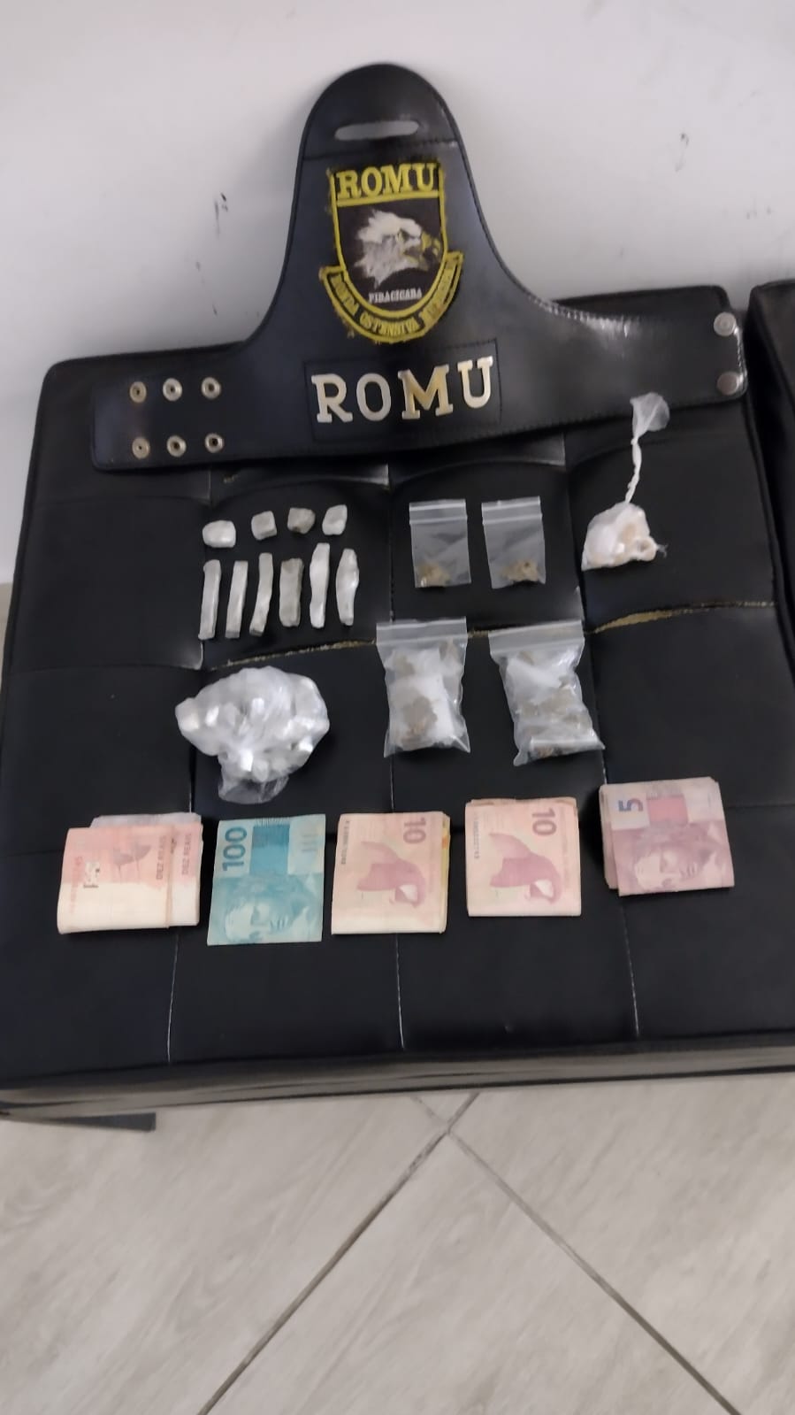 Já o detido foi abordado e submetido a busca pessoal. Com ele foram encontradas duas porções de skank em sua mão e mais 22 no bolso. Questionado sobre os entorpecentes, indicou que a 5 metros do local havia outros entorpecentes, sendo localizadas mais 18 pedras de crack e 38 porções de maconha. O detido ainda relatou que sua companheira estava do outro lado da rua com o dinheiro da venda das drogas e ela apresentou R$ 448 que estava em seu bolso e um celular Samsung e frisou que apenas segurava o dinheiro.