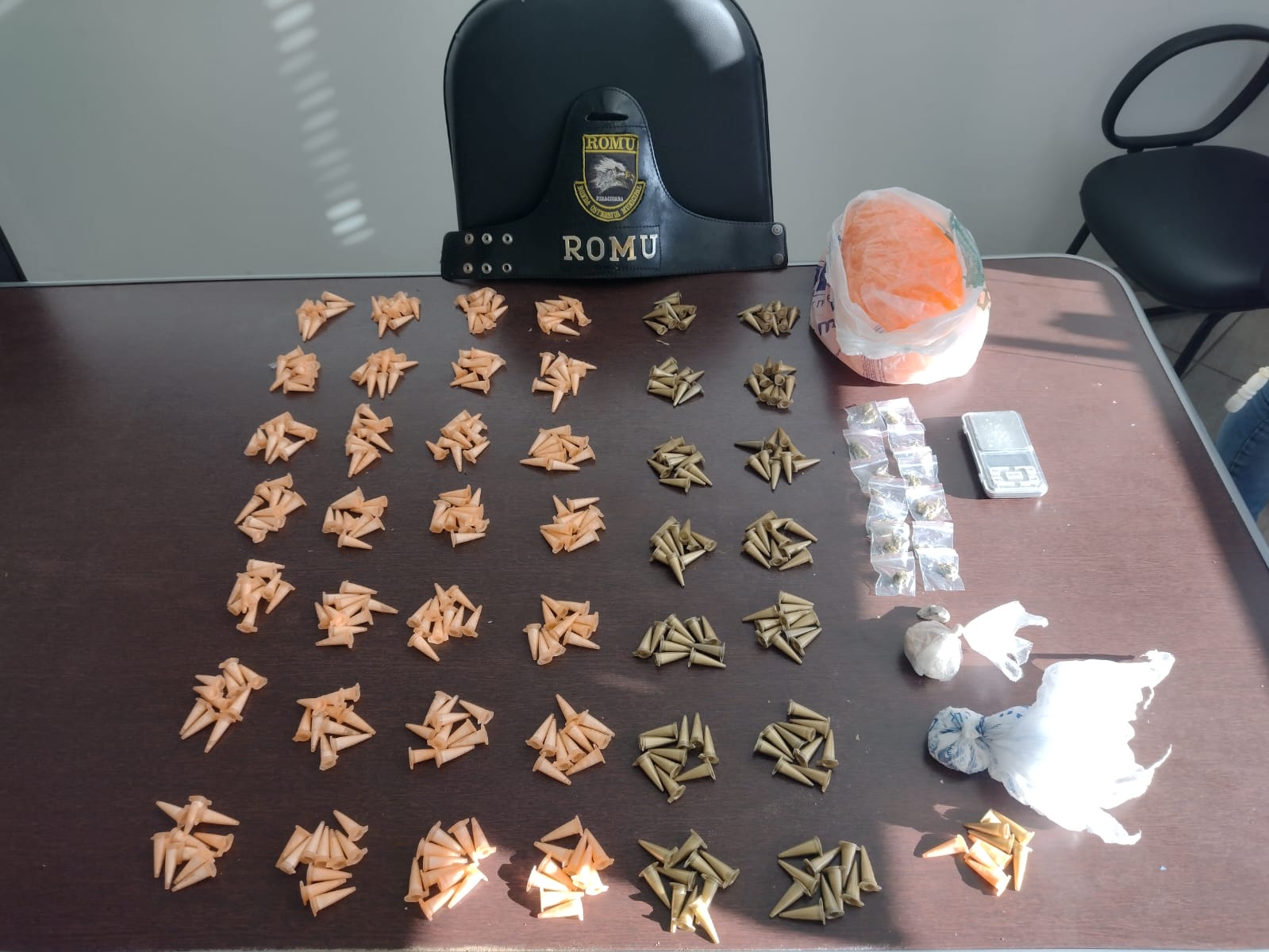 A Romu (Ronda Ostensiva Municipal, da Guarda Civil) realizou na tarde de ontem, 30/06, apreensão de drogas em área verde localizada na rua Carlos Chagas, s/n, no bairro Santa Fé. Foram apreendidos 429 pinos de cocaína prontos para venda, 34,4 gramas de cocaína a granel, 15 porções de maconha e 19,5 gramas de crack (pedra bruta), além de uma balança de precisão e 1.000 pinos vazios.