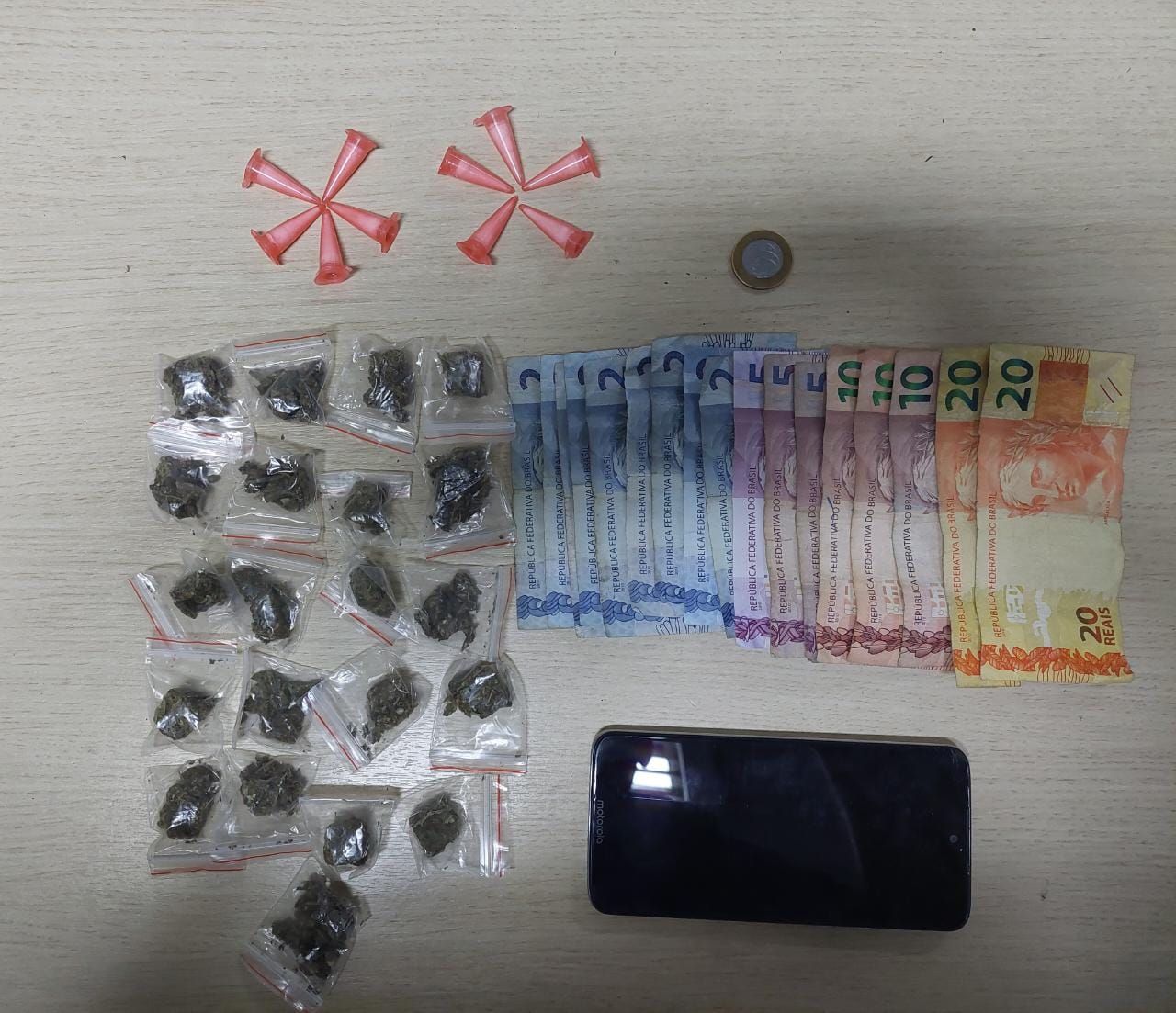 A ocorrência começou quando durante patrulhamento em escola nas imediações do condomínio e com a informação de que havia um evadido do sistema prisional pelas redondezas, as equipes da Romu 84 e 92, formadas pelos GCs Glauco, Gomes, Rocha e Saturnino (84) e GCs Willian, Miranda e Macedo, avistaram o homem caminhando. Ao ver a viatura, ele fugiu em direção ao condomínio e dispensou uma sacola, onde foram encontrados 21 porções de maconha e 10 microtubos de cocaína.