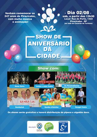 • Show de Aniversário da Cidade Dia: 02 de agosto – sábado Horário: a partir das 13h Local: Rua do Porto, 1433 – Piracicaba – SP (ao lado do Casarão do Turismo) Programação Musical: As Piracicabanas (Orquestra Feminina de Viola Caipira), Samba d'Aninha, Sambatuk, Dona Zaíra, Rangel Costa, Lucas e João Pedro. Atividades Gratuitas: Pipoca, Algodão doce, Brinquedos (cama elástica, balão pula pula, e outros)