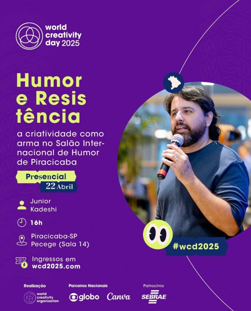 A palestra Humor e Resistência – a Criatividade como Arma no Salão Internacional de Humor de Piracicaba será realizada no dia 22/04, às 16h, no Pecege, como parte da programação oficial do World Creativity Day em Piracicaba. O encontro será conduzido por Junior Kadeshi, publicitário e coordenador do Salão de Humor, e abordará a trajetória do evento que transformou Piracicaba em referência mundial do humor gráfico.