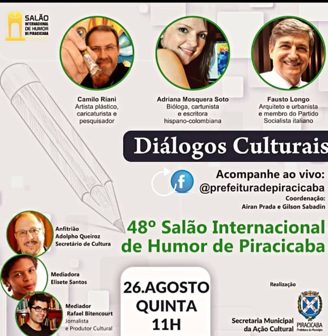 SERVIÇO – Live Diálogos Culturais: 48º Salão Internacional de Humor de Piracicaba. Transmissão na quinta-feira, 26/08, a partir das 11h, na página da Prefeitura de Piracicaba no Facebook (@prefeituradepiracicaba).