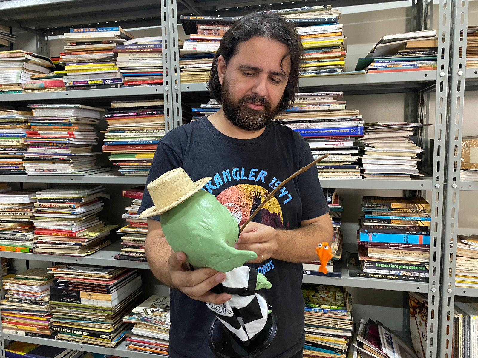 Junior Kadeshi, o diretor do Salão, analisa escultura recebida, ainda não selecionada