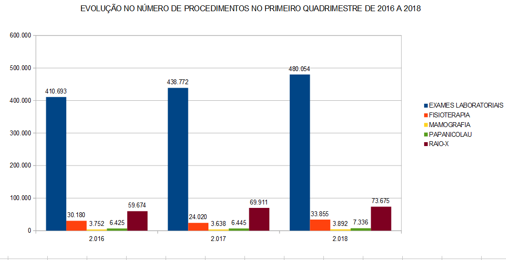 Em relação ao desempenho, o mais expressivo foi o volume de exames de raio-x, que saltou de 59.671 para 73.675 de um período para outro. Aumento de 23%. Os exames laboratoriais também tiveram boa diferença. De 410.693 no quadrimestre de 2016, passaram para 480.054 no mesmo trimestre deste ano. Uma produção 17% maior. A produção de Papanicolau seguiu essa tendência. De 6.425 exames no período, passou para 7.336. Alta de 14%.