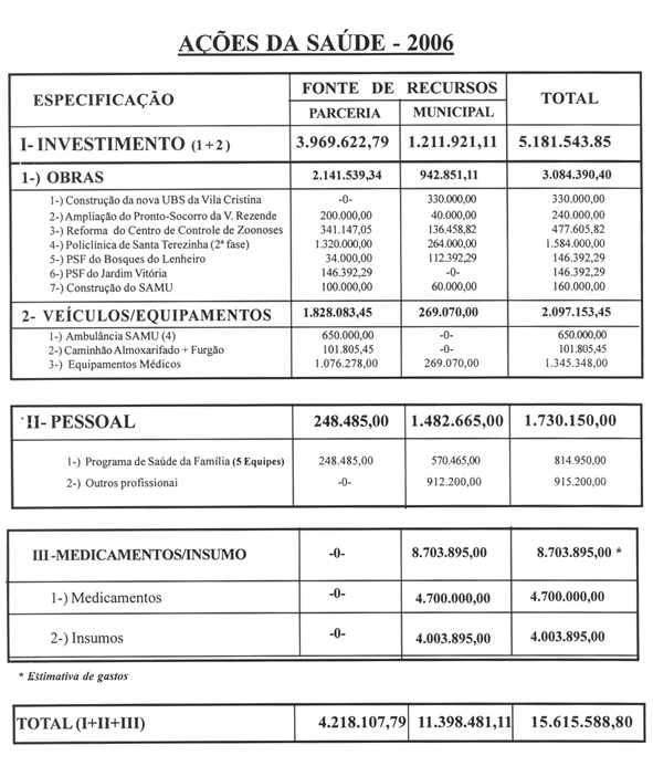 Durante a apresentação do pacote, o prefeito Barjas Negri fez balanço 2005, com investimento de R$ 6,6 milhões, que foi responsável pela reforma de unidades e a implantação de 5 novas equipes do Programa de Saúde da Família. Para este ano, mais 5 novas equipes serão criadas, totalizando 30 equipes, ou 120 mil pessoas atendidas.