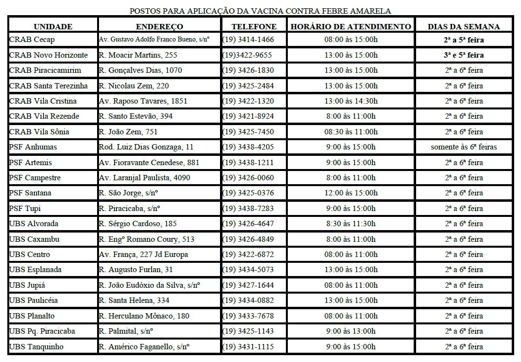 Em Piracicaba não foi registrado nenhum caso de febre amarela em 2015, 2016 e início deste ano. A cidade também não se encontra em área epidêmica e de recomendação para a vacina. Entretanto, a Secretaria de Estado da Saúde orienta a vacinação para as pessoas, a partir de 9 meses de idade, que vivem na zona rural do município ou que se deslocam para a zona rural com frequência. Protocolo que já é padrão em Piracicaba desde 2009. A vacina é encontrada nos seguintes postos de saúde:
