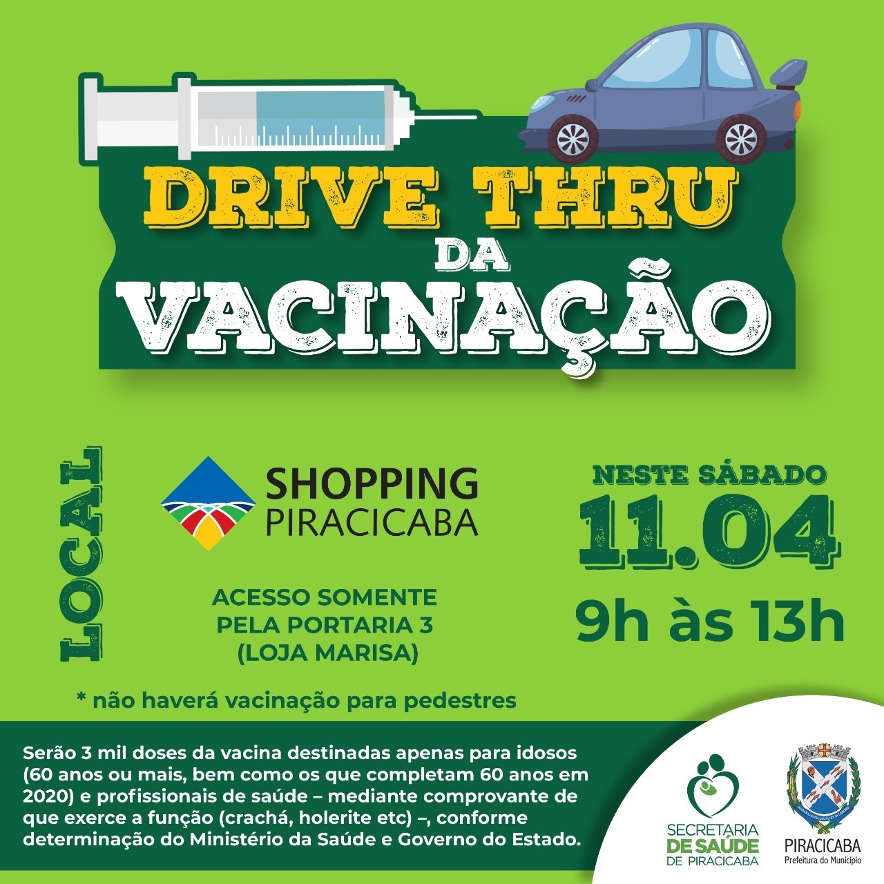 A Prefeitura de Piracicaba, por meio da Secretaria Municipal de Saúde, realiza neste sábado (11/04) a vacinação contra a gripe no sistema 'drive thru'. A ação será no Shopping Piracicaba – acesso somente de veículos pela portaria 3 – Loja Marisa (Rua Cesário Simioni), das 9h às 13h, quando serão disponibilizadas 3 mil doses da vacina. Não haverá vacinação para pedestres.