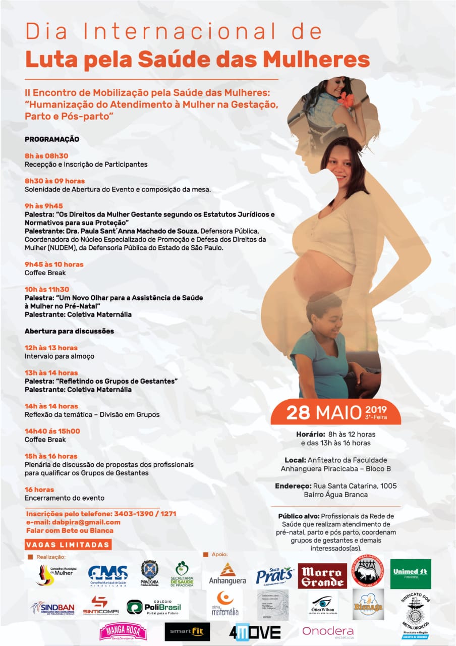 O II Encontro de Mobilização pela Saúde das Mulheres, Humanização do Atendimento à Mulher na Gestação, Parto e Pós-parto, conta com o apoio da Faculdade Anhanguera Piracicaba, Suco Prats, Café Morro Grande, Sindicato dos Trabalhadores Municipais de Piracicaba, Sindicato dos Metalúrgicos de Piracicaba, Sindicato dos Bancários de Piracicaba, Sindicato dos Trabalhadores nas Indústrias de Construção e do Mobiliário de Piracicaba, Colégio Polibrasil, Ótica Wilson, Manga Rosa, Academia Smart Fit, Onodera Estética, Bisnaga Alimentos, 4Move, Coaching Camila Joia, Coletiva Maternália, Experimento Útero Núcleo Corpoesia e Espaço Herbalife.