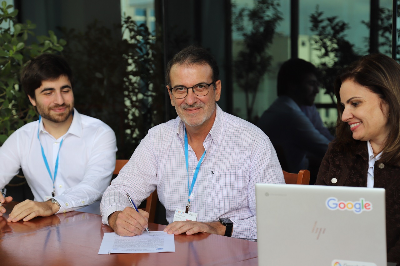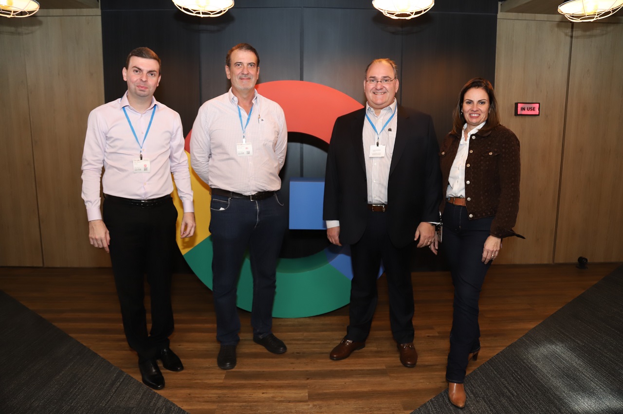 O secretário de Educação Bruno Roza e o prefeito Luciano Almeida com representantes do Google durante a assinatura da parceria na sede da empresa em SP.
