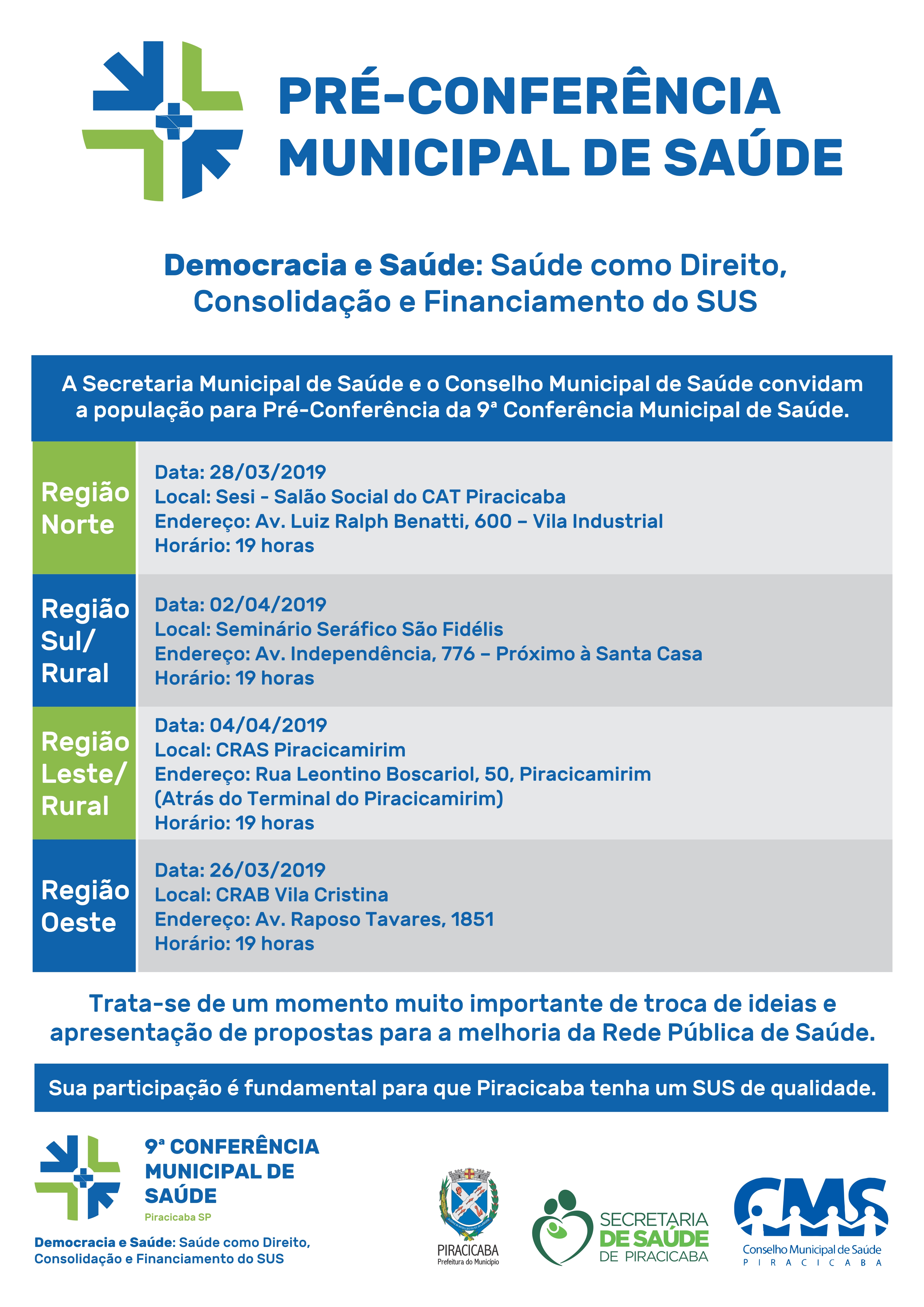 Serão realizadas quatro pré-conferências, sendo uma em cada região da cidade – Norte, Sul/Rural, Leste/Rural e Oeste –, conforme tabela abaixo. Nesses encontros, os participantes são devidamente orientados sobre a importância da 9ª Conferência Municipal de Saúde, como ela se desenvolve e a função de cada participante no processo de discussão e votação das propostas apresentadas.