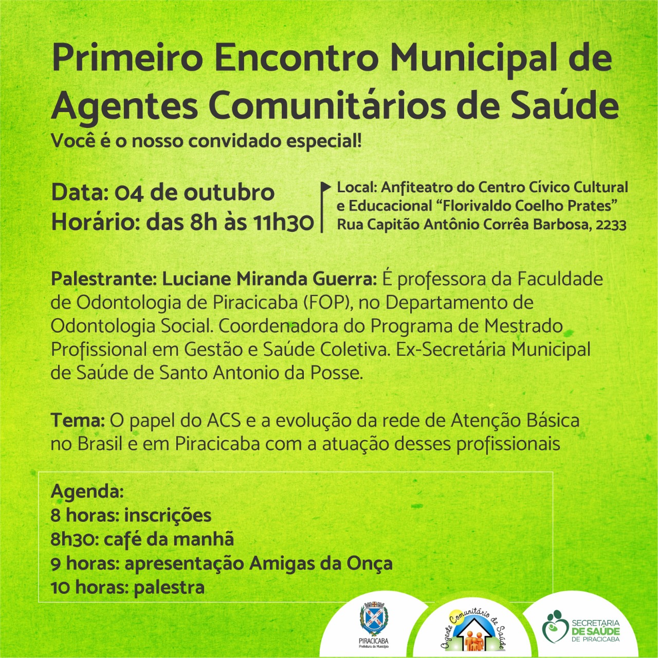 Durante o encontro haverá uma palestra proferida pela professora da Faculdade de Odontologia de Piracicaba (FOP), no Departamento de Odontologia Social, Luciane Miranda Guerra, com o tema “O papel do ACS e a evolução da rede de Atenção Básica no Brasil e em Piracicaba devido à atuação desses profissionais”. A palestrante é Coordenadora do Programa de Mestrado Profissional em Gestão e Saúde Coletiva e ex-secretária municipal de Saúde de Santo Antonio da Posse. Antes da exposição, o grupo Amigas da Onça, composta por mulheres que superaram o câncer, ligadas ao Cecan, da Santa Casa, vão apresentar uma esquete musical.