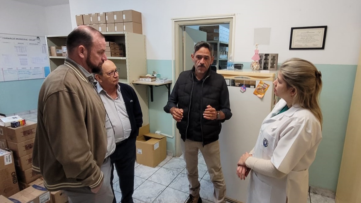 Filemon e o vereador Fabricio conversam com a auxiliar de farmácia, Rogéria Gama, na farmácia do Cecap
