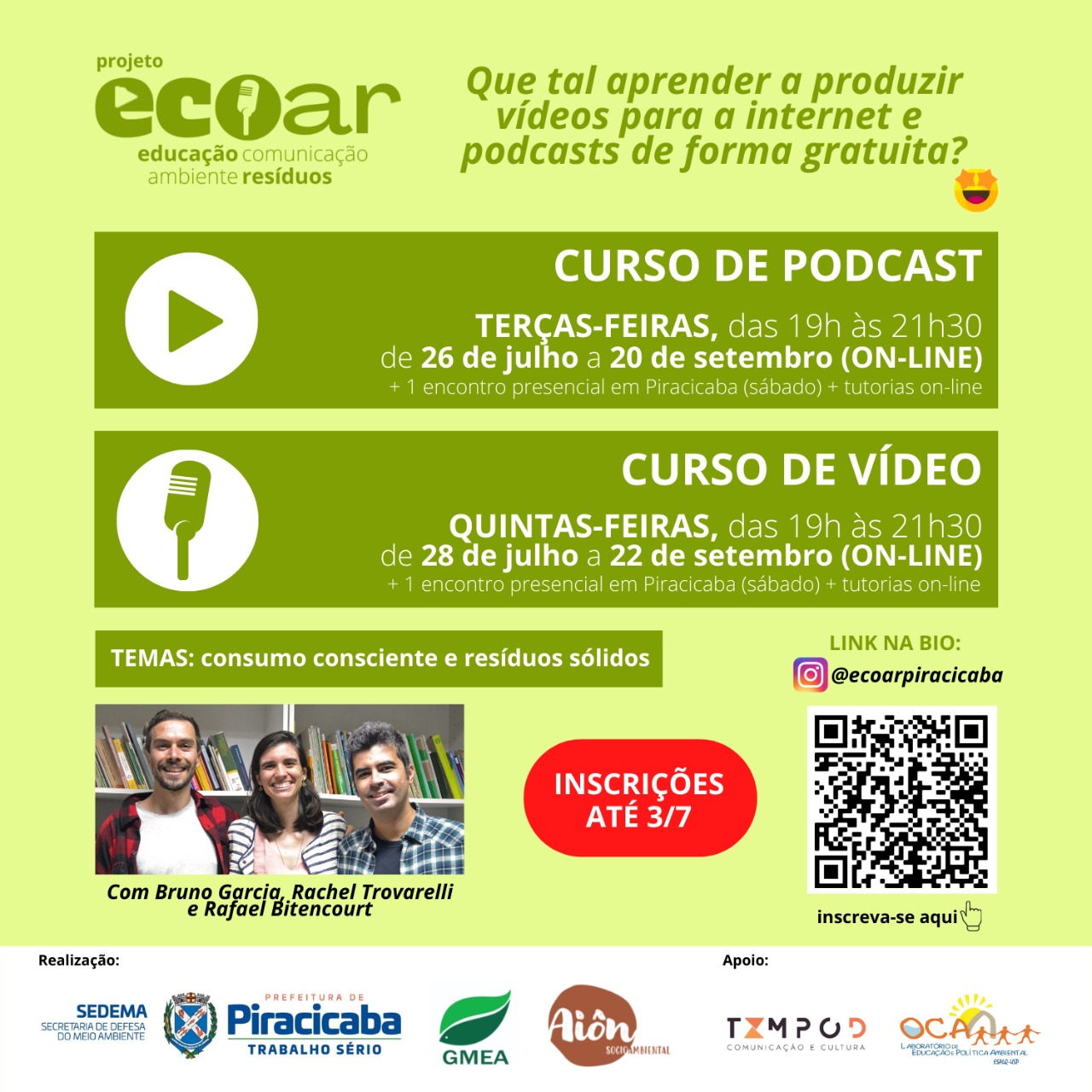 A Prefeitura, por meio da Secretaria de Defesa do Meio Ambiente de Piracicaba (Sedema), abriu inscrições para o Projeto Ecoar – Educação, Comunicação, Ambiente e Resíduos, que vai realizar os cursos de podcast e vídeos para a internet. Ambos são gratuitos e serão realizados de forma semipresencial (aulas online e um encontro presencial em cada curso). Os interessados podem se inscrever preenchendo o formulário (leia abaixo) até o dia 03/07.