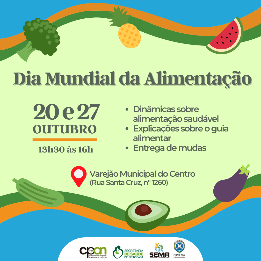 O Varejão Municipal do Centro recebe, amanhã, quarta-feira, 20, e no dia 27/10, atividade gratuita alusiva ao Dia Mundial da Alimentação (16/10), promovida pela Prefeitura de Piracicaba, por meio da CPAN (Coordenadoria de Programas de Alimentação e Nutrição) e da Sema (Secretaria Municipal de Agricultura e Abastecimento).