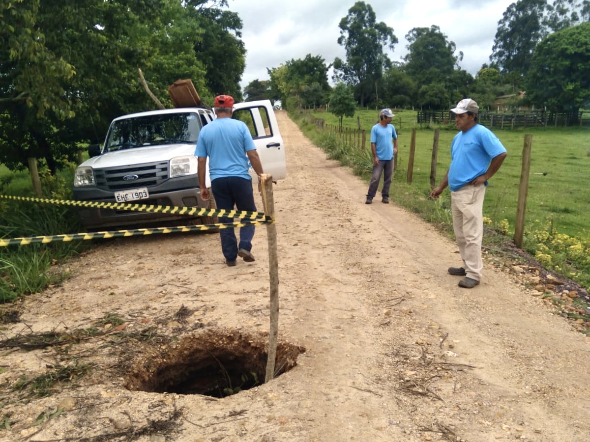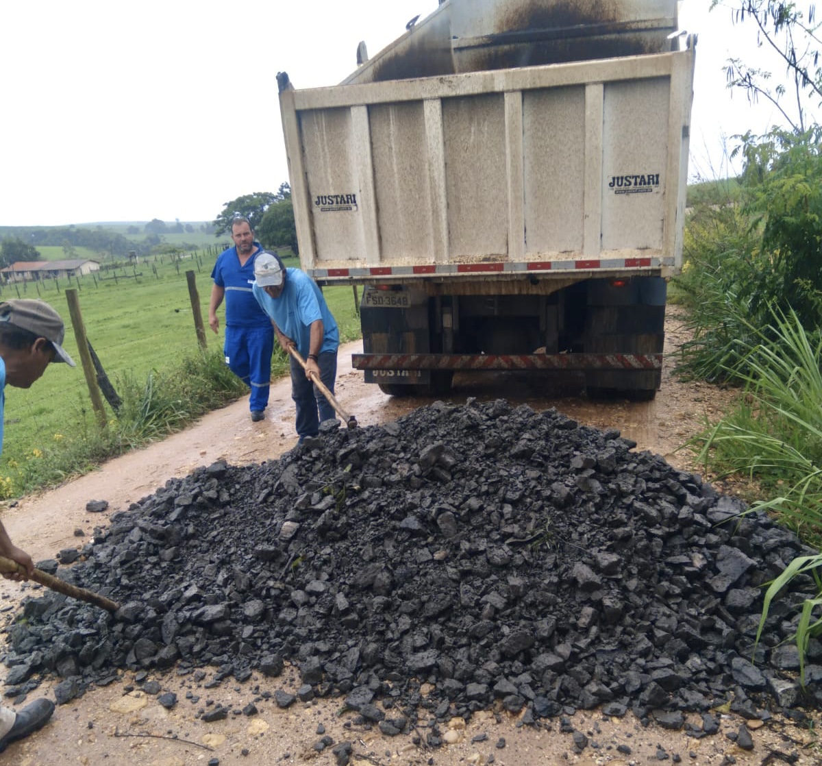 Outro reparo emergencial foi realizado na PIR 222, no bairro Almeida. No local, um buraco abriu no meio da estrada, também perto de uma tubulação. A equipe fez o tapa buraco com aplicação de lajão britado e liberou a passagem.