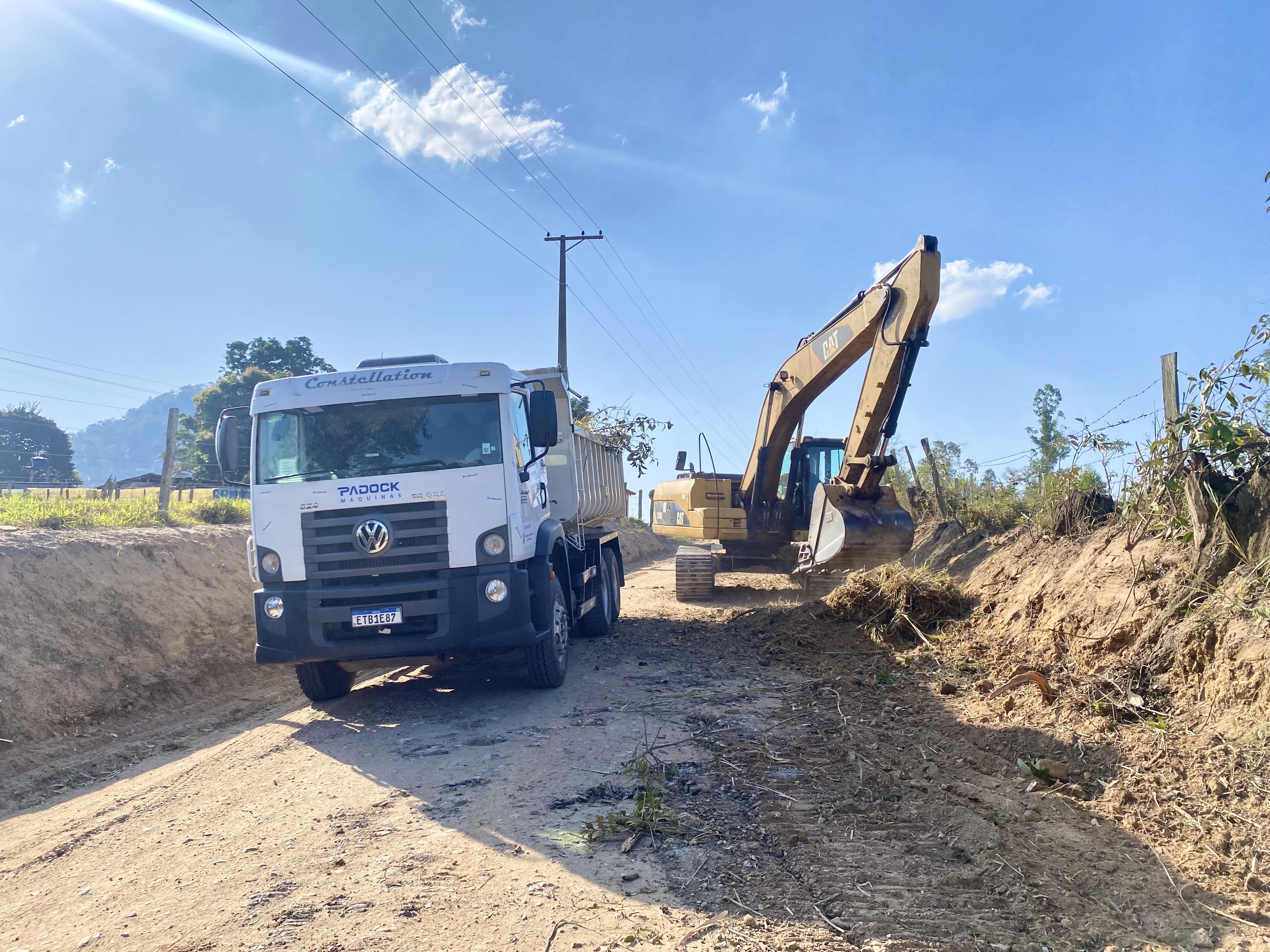 Foi realizada a limpeza e manutenção da saída de água da estrada Aniceto Cogo (PIR 017W), no bairro Floresta, com auxílio da retroescavadeira, escavadeira e caminhão basculante. Os trabalhos continuam na semana que vem.