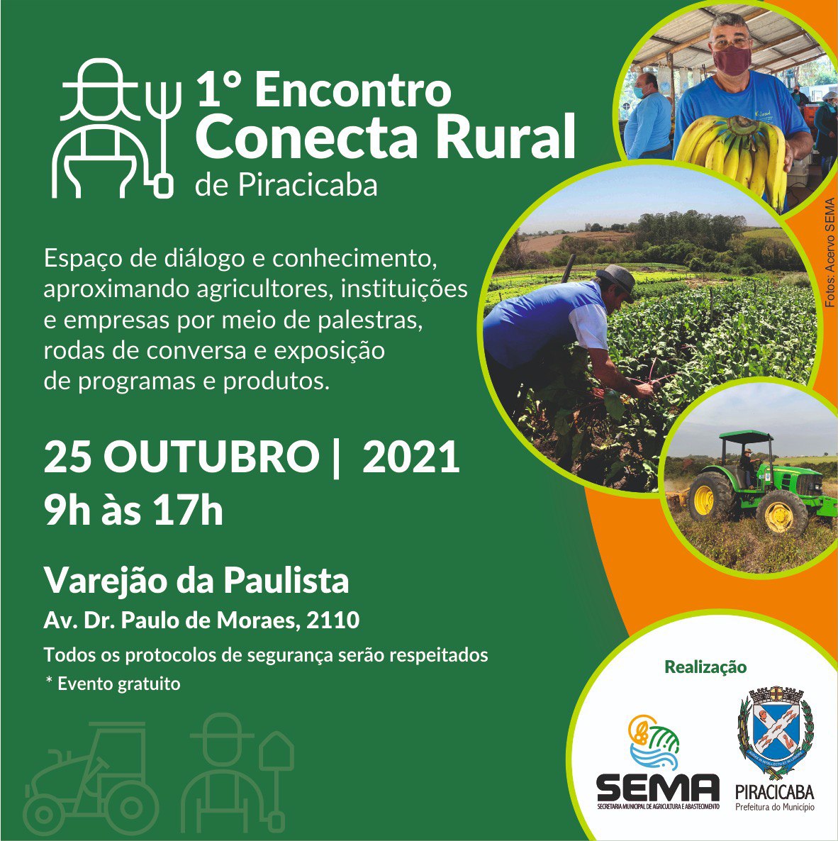 Na segunda-feira, 25/10, das 9h às 17h, o espaço do Varejão da Paulista receberá o 1º Encontro Conecta Rural, organizado pela Sema (Secretaria Municipal de Agricultura e Abastecimento) para aproximar agricultores, instituições e empresas por meio de palestras, rodas de conversa e exposição de programas e produtos.