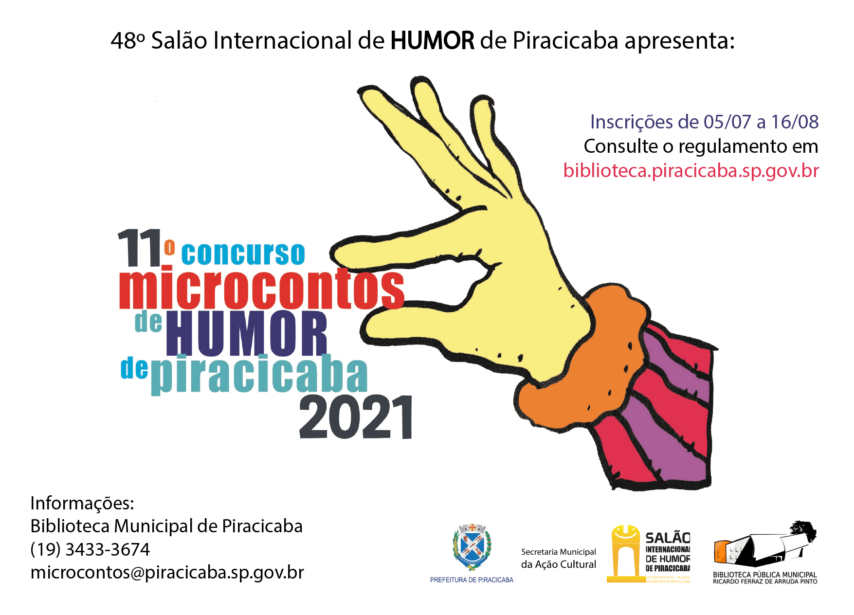 SERVIÇO – Inscrições para o 11º Concurso Microcontos de Humor de Piracicaba 2021. De 05/07 a 16/08. Regulamento e Ficha de inscrição disponíveis no link: http://biblioteca.piracicaba.sp.gov.br/site/concursos-literarios/microcontos/