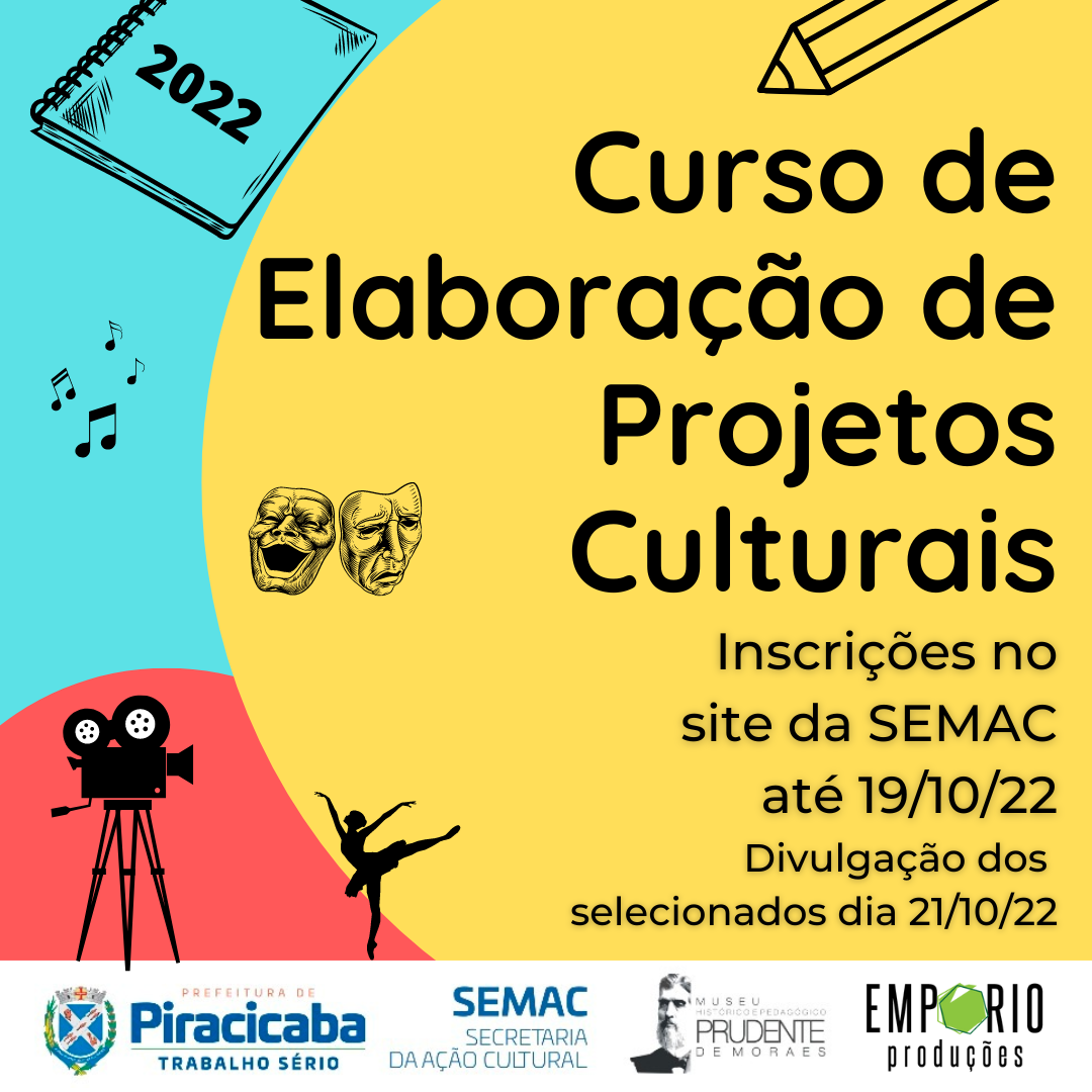 A Prefeitura de Piracicaba, por meio da Secretaria Municipal da Ação Cultural (Semac), oferece a segunda edição do curso de elaboração de projetos culturais, totalmente gratuito, em parceria com a Empório Produções, destinado a artistas e fazedores de cultura do município. As inscrições foram prorrogadas até 19/10/22, com início do curso em 24/10/22 e número limitado de 30 vagas.