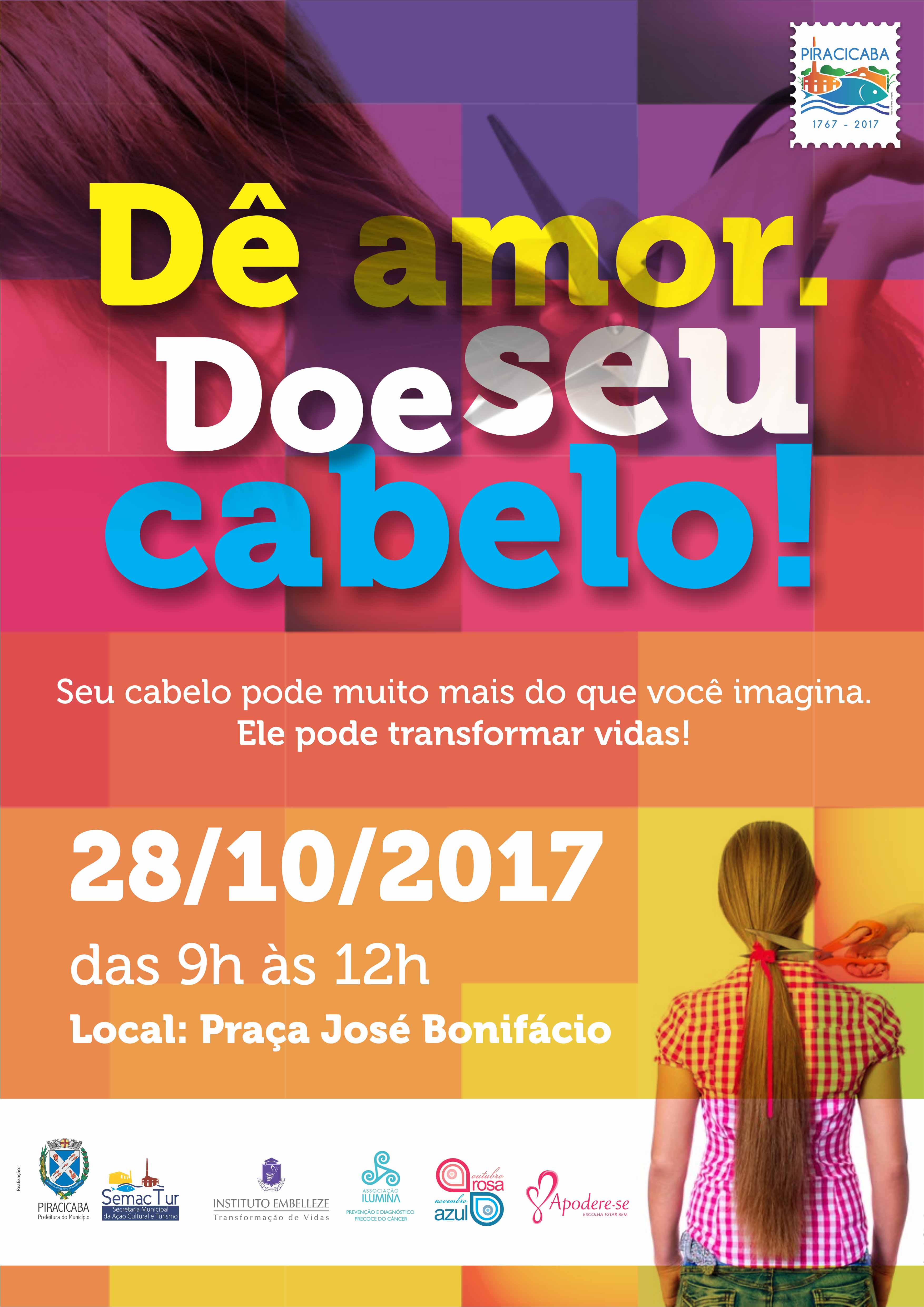 A Secretaria Municipal da Ação Cultural e Turismo (SemacTur) em parceria com o Instituto Embelleze e a Associação Ilumina, promovem neste sábado (28), das 9h às 12h, na praça José Bonifácio, a ação social “Dê amor. Doe seu cabelo!”. O evento tem o objetivo de estimular a doação de mechas de cabelo, que serão usadas na confecção de perucas para pacientes em tratamento de câncer.