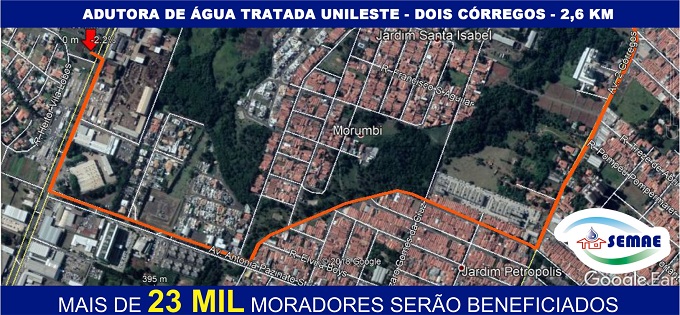 O engenheiro de Saneamento do Semae, Pedro Caes, explica que a construção da adutora Unileste-Dois Córregos é a 1ª de 3 etapas de obras previstas no Plano Diretor de Abastecimento de Água. São obras necessárias para regularizar a demanda atual e atender às demandas futuras, reforçando o fornecimento de água de cerca de 23 mil pessoas já estabelecidas e mais cerca de 14 mil que foram estimadas para ocupar a região até o ano de 2030, conforme o Plano Diretor de Abastecimento de Água.