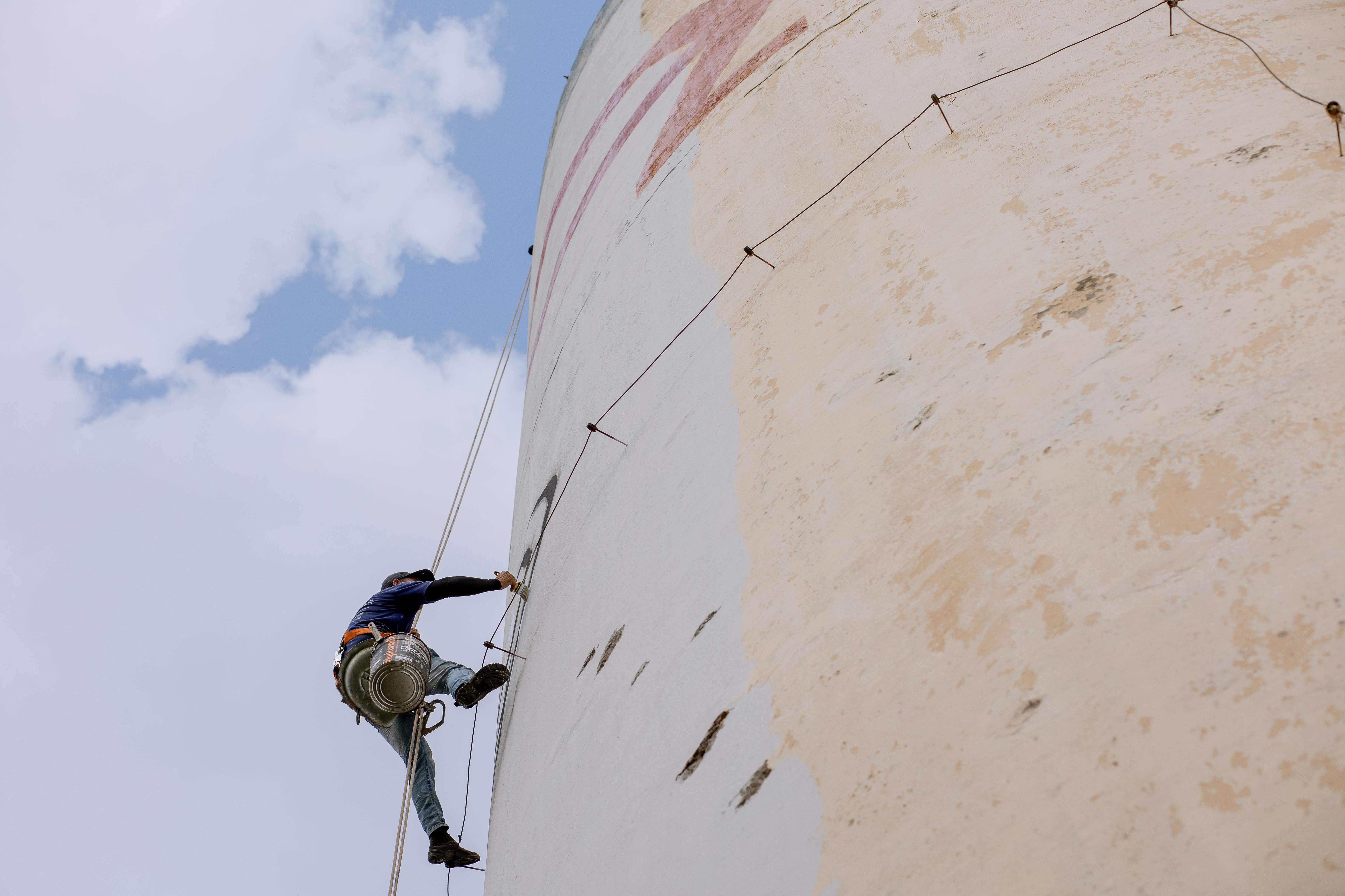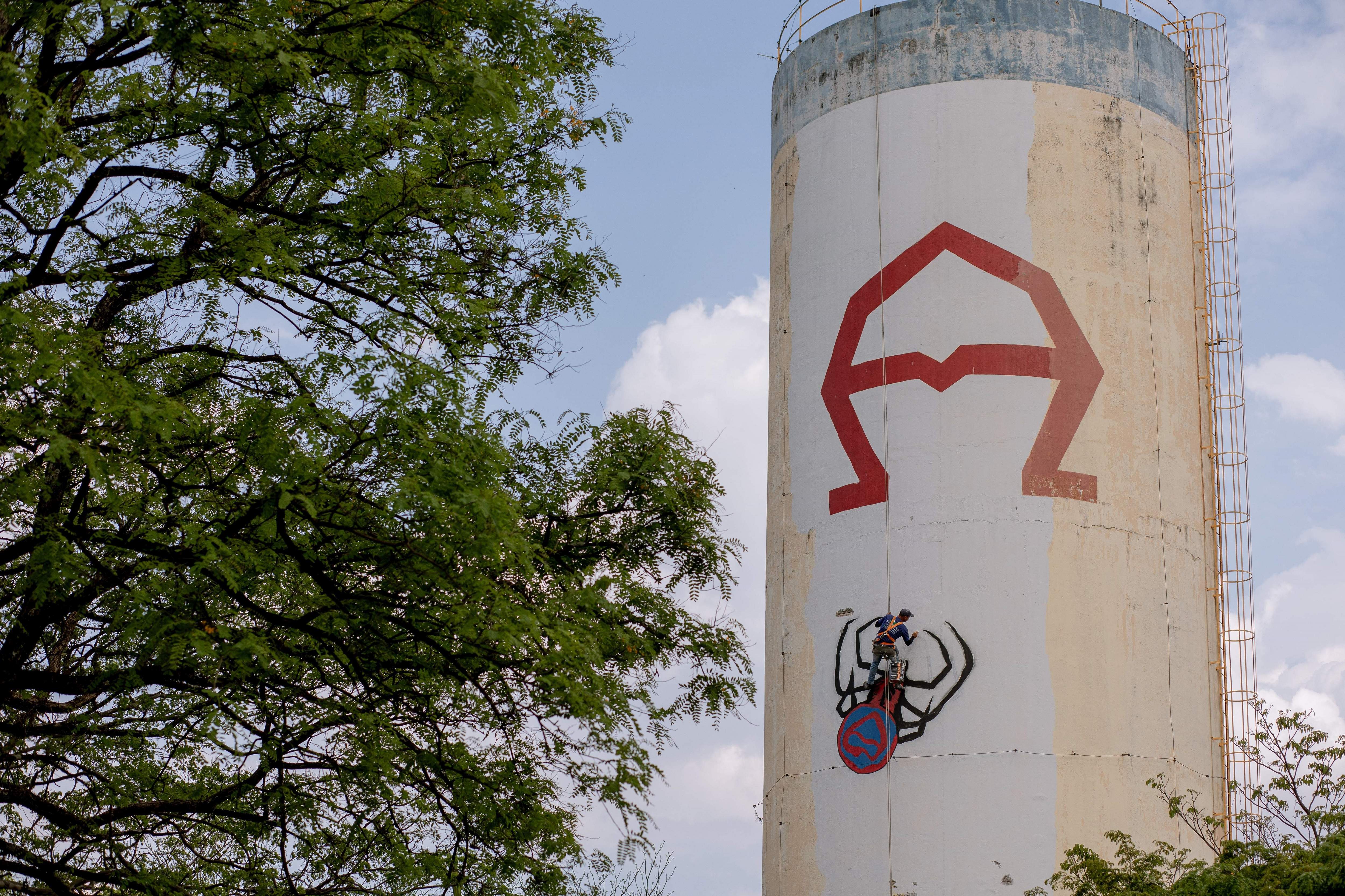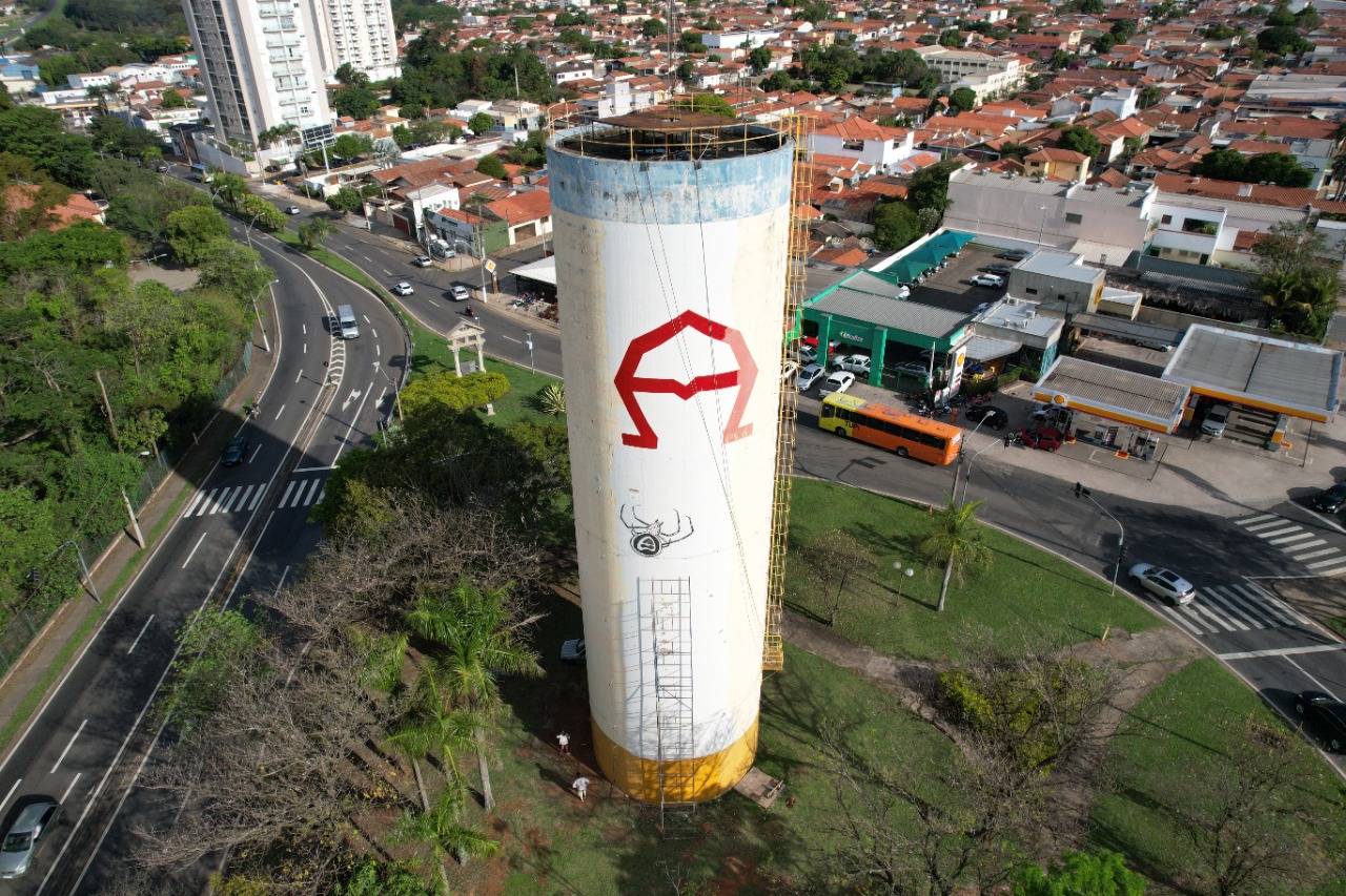 Reservatório construído em 1983 se localiza em uma das entradas de Piracicaba e acabou se tornando um marco na cidade pela história e curiosidade dos símbolos pintados (Warwick Manfrinato) A ideia da parceria surgiu dos ex-alunos da turma de 1987 da Esalq, como forma de celebrar os 35 anos de formatura, a serem completados em 2022. A pintura, inclusive, agora contará com a estampa F87, em alusão à turma de formandos. Darcy Lázaro Ganzella Junior, diretor do Departamento de Construção Civil, Oficina e Transporte (DCCOT) do Semae, conta que, da parte da autarquia, além da liberação para a pintura, foram cedidas as latas de tinta. Para a Adealq ficou a responsabilidade da contratação de mão de obra da pintura completa, logo do Semae, o A Encarnado e a aranha. “Quando uma cidade tem alguns ícones e consegue-se reunir pelo menos dois deles, o ganho é imenso. Neste caso, em particular, a profícua parceria entre Semae e Esalq para a manutenção de um símbolo como a aranha pendurada no A Encarnado, pintados no reservatório que recebe as pessoas que chegam a Piracicaba, transcende uma simples manifestação cultural e torna-se representativa de um povo e sua história. O Semae e seus funcionários sentem-se orgulhosos de poder contribuir com a turma que completa 35 anos de formados do curso de Agronomia, da Escola Superior, que é referência nacional e internacional, caracterizado como importante polo de desenvolvimento industrial e agrícola”, comentou Ganzella.
