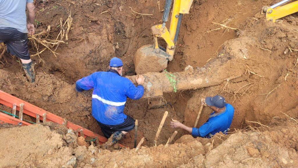 O rompimento ocorreu em decorrência da instabilidade da pressão da água na rede, o que acabou atingindo pontos enfraquecidos, já que a adutora é antiga.