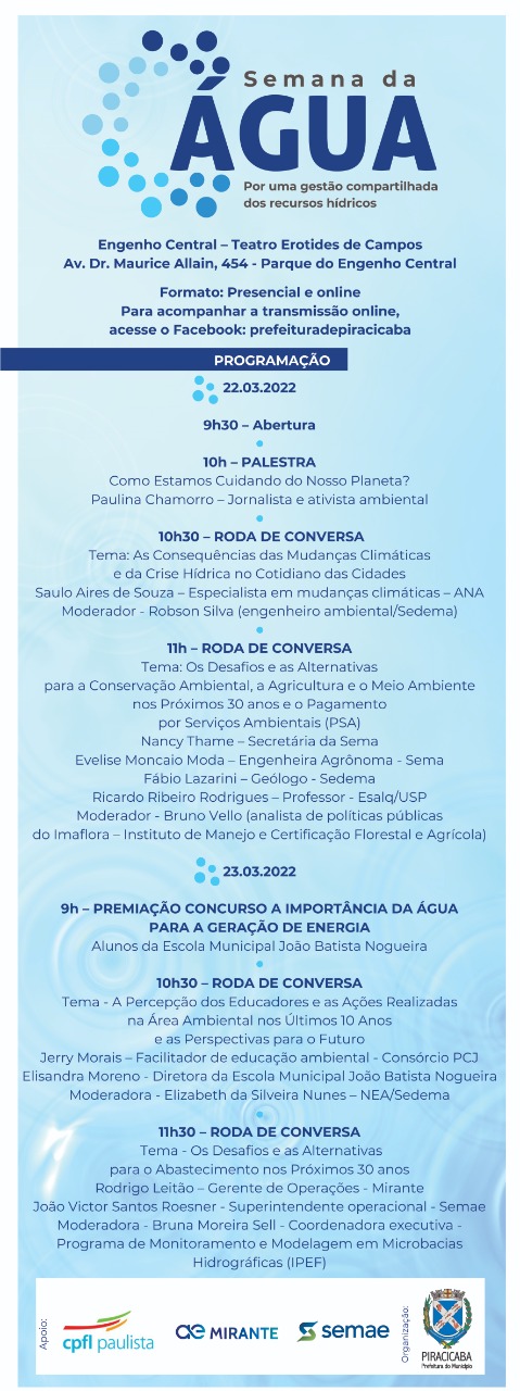 A Prefeitura de Piracicaba, por meio das secretarias municipais de Defesa do Meio Ambiente (Sedema) e Agricultura e Abastecimento (Sema) e Semae (Serviço de Água e Esgoto), e os parceiros Mirante e CPFL Paulista, realizam amanhã, 22/03, às 9h30, e quarta, 23/03, a partir das 9h, a Semana da Água – Por uma Gestão Compartilhada dos Recursos Hídricos. O evento, aberto ao público, acontecerá no Teatro Erotides de Campos, no Engenho Central, e será composto por palestras e rodas de conversa, além de concurso de desenho e plantio de mudas. A realização será nos formatos presencial e online. O encontro marca o Dia Mundial da Água, comemorado amanhã, 22/03, e vai debater alternativas e apresentar casos de sucesso sobre os recursos hídricos, compartilhados por especialistas, que falarão de temas como mudanças climáticas, crise hídrica, conservação ambiental, programas de incentivo à preservação de nascentes, como o PSA (Pagamento por Serviços Ambientais), desenvolvido em Piracicaba, educação ambiental e a importância da água para a geração de energia elétrica. A abertura, amanhã, será feita pelo prefeito Luciano Almeida, com fala, também, de secretários e parceiros, Mirante, CPFL Paulista, além do Comitês PCJ, Agência PCJ, Consórcio PCJ e Gaema-PCJ. A primeira palestra, que acontecerá às 10h no formato online, intitulada Como Estamos Cuidando do Nosso Planeta?, ficará a cargo da jornalista Paulina Chamorro, que trabalhou durante dez anos na Rádio Eldorado, assina grandes reportagens sobre meio ambiente e sustentabilidade, é colaboradora da National Geografic Brasil e cofundadora da Liga das Mulheres pelos Oceanos, além de ser idealizadora do podcast Vozes do Planeta. Na sequência, haverá roda de conversa com Saulo Aires de Souza, especialista em mudanças climáticas da Agência Nacional de Águas e Saneamento (ANA). Souza falará sobre as consequências das mudanças climáticas e da crise hídrica no cotidiano nas cidades. Ainda amanhã, outra roda de conversa, às 11h, vai tratar sobre conservação ambiental, o futuro da agricultura e do meio ambiente e o programa municipal Pagamento por Serviços Ambientais (PSA), para conservação de nascentes. Participam a secretária da Sema, Nancy Thame, Evelise Moncaio Moda, agrônoma da Sema, Fábio Lazarini, geólogo da Sedema, e Ricardo Ribeiro Rodrigues, professor da Esalq/USP. Na quarta-feira, 23/03, o encontro será aberto com premiação dos alunos da Escola Municipal João Batista Nogueira, às 9h, pela participação no concurso A Importância da Água para a Geração de Energia. Na sequência, haverá roda de conversa com os educadores Elisandra Moreno, diretora da Escola Municipal João Batista Nogueira, e Jerry Morais, do Consórcio PCJ. Mais uma roda de conversa acontece na quarta, sobre desafios para o abastecimento, com João Victor Santos Roesner, do Semae, e Rodrigo Leitão, da Mirante. Ainda como parte da programação da Semana Mundial da Água, no sábado, 26/03, haverá plantio de cerca de 500 mudas de árvores nativas pelo programa Plante Vida, a partir das 9h, no Altos do São Francisco.