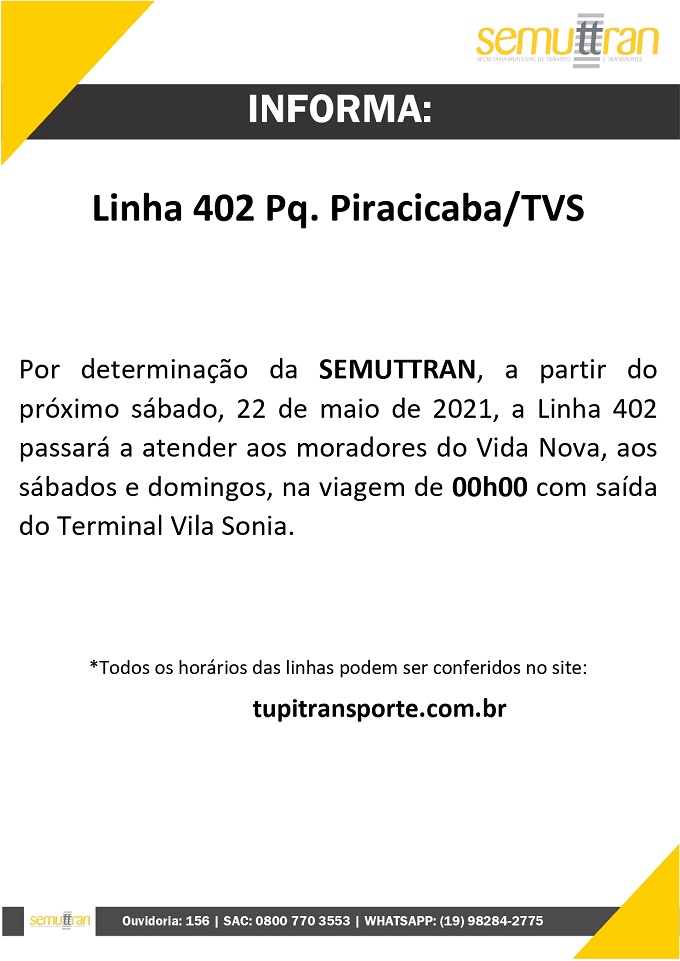 Semutran informa: linha 402 Parque Piracicaba/TVS