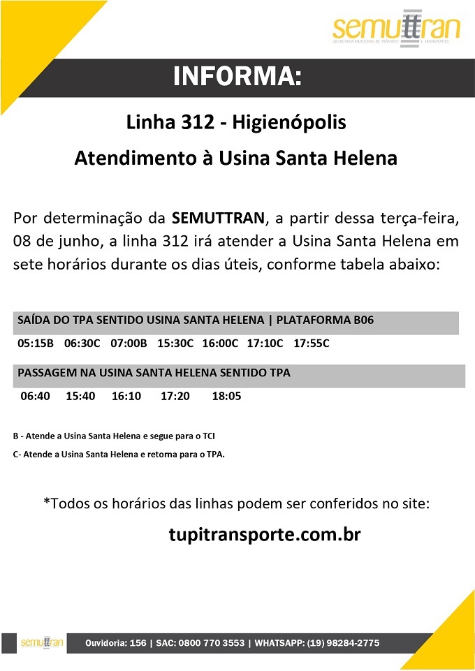 A Prefeitura, por meio da Secretaria Municipal de Mobilidade Urbana, Trânsito e Transportes (Semuttran) disponibiliza, a partir de hoje, 08/06, a linha de ônibus 312-Higienópolis, em sete horários durante os dias úteis, saindo do Terminal da Pauliceia, com destino à Usina Santa Helena.