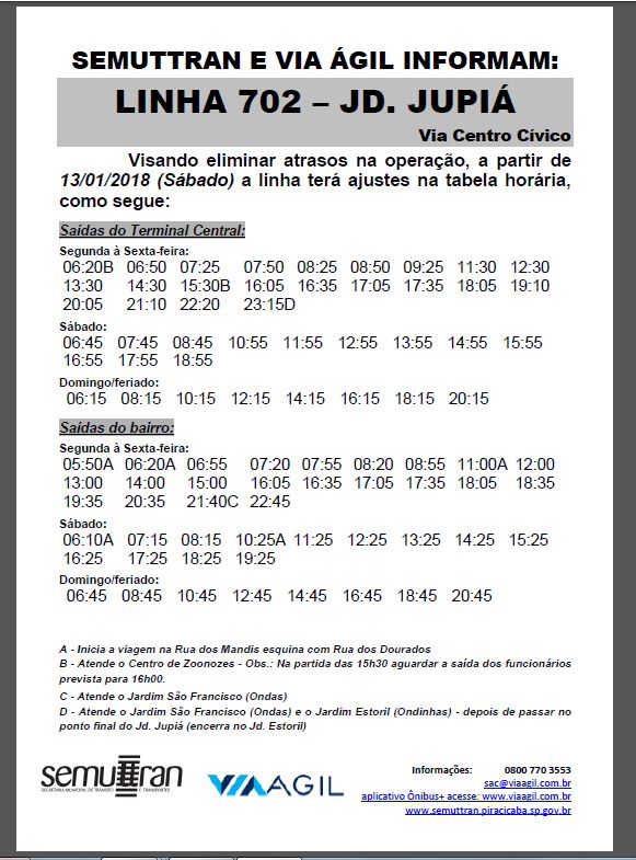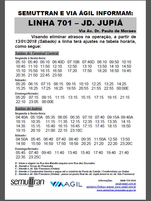 Para eliminar atrasos, a Semuttran e a Via Ágil decidiram reajustar a tabela horária das linhas 701 e 702 do Jardim Jupiá. Os novos horários começam a valer a partir deste sábado, 13 de janeiro (2018), como segue: