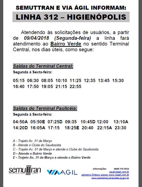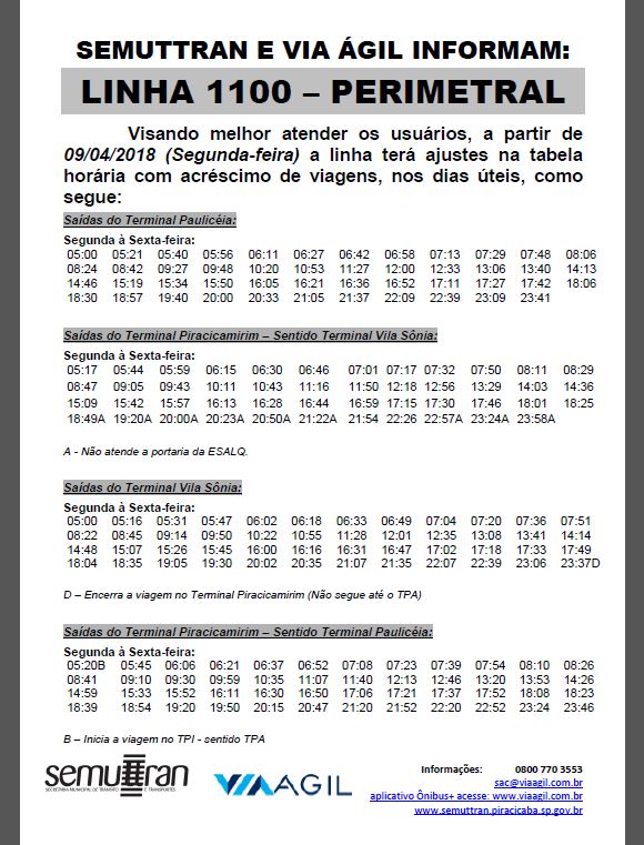 Seguem novas alterações realizadas pela Semuttran e Via Ágil, que serão iniciadas na próxima segunda-feira – 09/04/2018: